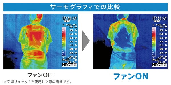 ●空調服独自開発の立体メッシュ構造スーパースペーサーで空気が背中全体に行きわたる