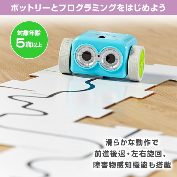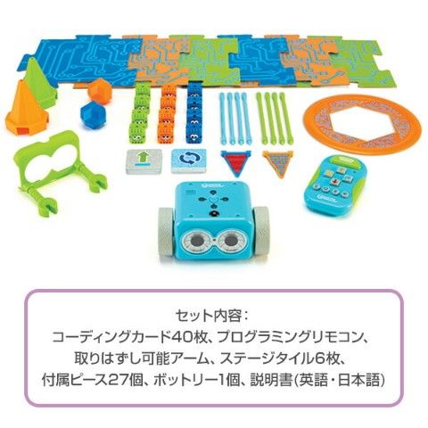 | 商品説明 | ●セット内容:コーディングカード40枚、プログラミングリモコン、取りはずし可能アーム、ステージタイル6枚、付属ピース27個、ボットリー1個、説明書(英語・日本語) ●単4電池5本使用(別売) ●対象年齢:5歳以上 ●リモコンでプログラミングができる ●滑らかな動作で前進後退・左右旋回、障害物感知機能も搭載 ●チャレンジ問題が封入しているため、プログラミングの基礎学習に最適 |