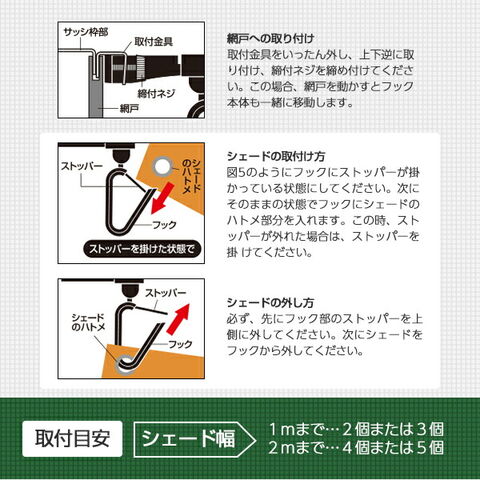 | 商品説明 | ●お得な4個セット ●耐荷重:3kg/組 ●取付目安(シェード幅):1mまでの場合/2個または3個、2mまでの場合/4個または5個 ●シェード、すだれ兼用で工具不要 ●揺れを吸収 ●サッシ枠網戸に取付 ●ネジ式で簡単取付 ●意匠登録出願済 ●サッシ枠が傷つきにくい ●取付方法 1.フック本体の締付ネジを緩めてください 2.最外部のサッシまたは雨戸枠を取付金具とフック本体の間に差し込み、締付ネジを締め付けて下さい 3.木片等を差し込んで締め付けるとよりしっかり固定されます 4.木部に取り付ける場合は取付金具を外しフック本体のみを直接、木ネジ、クギ等で取り付けてください ※木ネジ、クギ等は別途お買い求めください 5.網戸へ取り付ける場合は、取付金具をいったん外し上下逆に取付締付ネジを締め付けて下さい 6.網戸を動かすとフック本体も一緒に移動します ●シェードの取り付け方 1.フックにストッパーがかかっている状態にしてください 2.そのままの状態でフックにシェードのハトメ部分を入れます 3.この時ストッパーが外れた場合は、ストッパーを掛けて下さい ●シェードの外し方 1.必ず、先にフック部のストッパーを上側に外して下さい 2.次にシェードをフックから外して下さい ●取り付けられる場所:アルミサッシ窓枠、雨戸枠、テラス、網戸など ※耐荷重以上のものを吊るしたり、シェード以外は掛けないでください ※ほとんどのサッシ枠に取付可能ですが一部のサッシ枠で取付部5mm以下、サッシの厚み5mm以上、サッシ枠と戸の隙間1mm以下の場合は取り付けできません ※風の強い日にはサッシ枠が曲がる恐れがありますのですだれを外して下さい ※シェードの大きさや取付部により必要に応じてフックの取付数を増やしてください |