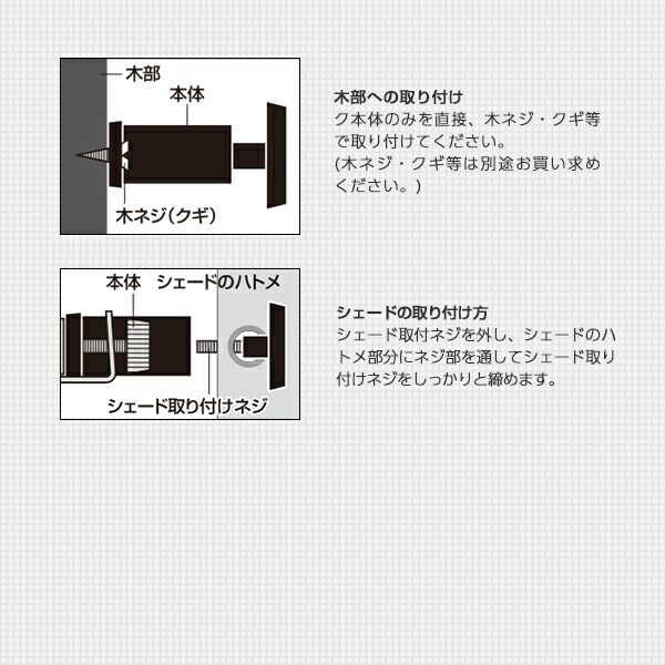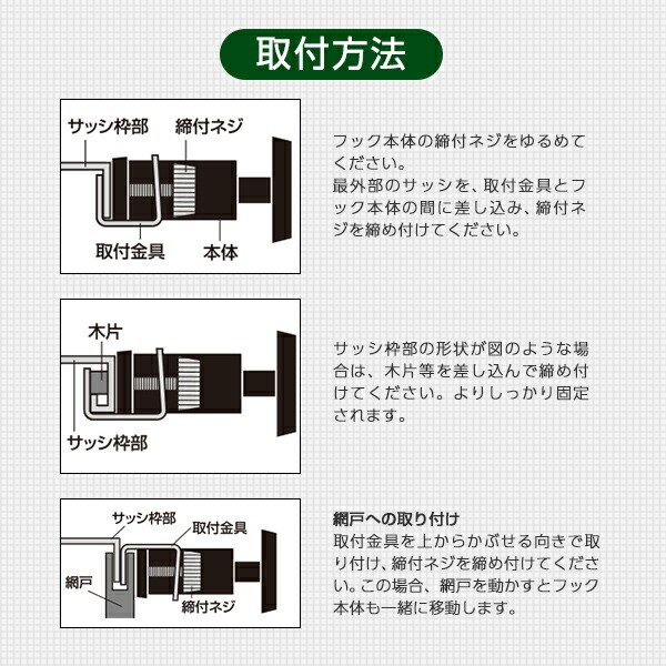 | 商品説明 | ●お得な4個セット ●耐荷重:3kg/組 ●取付目安(シェード幅):1mまでの場合/2個または3個、2mまでの場合/4個または5個 ●シェード、すだれ兼用で工具不要 ●見た目すっきり ●サッシ枠網戸に取付 ●シェードにシワがよりにくく、隙間から日差しが入らない ●意匠登録出願済 ●サッシ枠に傷が付かない ●取付方法 1.フック本体の締付ネジを緩めてください 2.最外部のサッシを取付金具とフック本体の間に差し込み、締付ネジを締め付けて下さい 3.木片等を差し込んで締め付けるとよりしっかり固定されます 4.網戸へ取り付ける場合は取付金具を上からかぶせる向きで取付、締付ネジを締め付けて下さい 5.この場合、網戸を動かすとフック本体も一緒に移動します 6.木部に取り付ける場合は取付金具を外しフック本体のみを直接、木ネジ、クギ等で取り付けてください ※木ネジ、クギ等は別途お買い求めください 7.シェード取付ネジを外し、シェードのハトメ部分にネジ部を通してシェード取付ネジをしっかり締めます ●取り付けられる場所:アルミサッシ窓枠、雨戸枠、テラス、網戸など ※耐荷重以上のものを吊るしたり、シェード以外は掛けないでください ※ほとんどのサッシ枠に取付可能ですが一部のサッシ枠で取付部5mm以下、サッシの厚み5mm以上、サッシ枠と戸の隙間1mm以下の場合は取り付けできません ※風の強い日にはサッシ枠が曲がる恐れがありますのですだれを外して下さい ※シェードの大きさや取付部により必要に応じてフックの取付数を増やしてください |