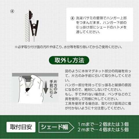 | 商品説明 | ●お得な4個セット ●耐荷重:3kg/組 ●取付目安(シェード幅):1mまでの場合/2個または3個、2mまでの場合/4個または5個 ● ●シェード、すだれ兼用 脱着可能 ●垂直面に、水平面に、スチール(鉄)面にシェードの着脱がワンタッチで可能 ●スチール(鉄)の平らなところに取り付けできます ●縦、横自在に動いて揺れを吸収 ●つまんでハトメを通すだけ ●マグネットと滑り止めシートで強力取付 ●取付方法 1.イラストと同じ向きになるように連結金具及びハンガーの向きを合わせてください 2.本体取付面の透明保護シートをはがしてください< ※この時すべり止めシートまで一緒にはがさないように注意して下さい ※透明保護シートがはがれにくい場合はセロハンテープ等をはってはがしてください 3.シェードを掛ける所にシェードを当てるなどして、あらかじめ取り付ける位置を決めてからマグネットを取り付けてください ※非常に強力なマグネットを使用しているので、取付時に指等を挟まないように十分注意して下さい 4.洗濯ばさみの要領でハンガー上部をつまんだまま、ハンガー下部の引っ掛け部にシェードのハトメを通してください ※必ず取付面のホコリ、汚れ、水分等をきれいに取り除いてからご使用下さい ●取り付けられる場所:シャッター、雨戸、ガレージなど平らなところ、スチール(鉄)製でネジ止めができない部分などに最適 ●取り外し方 ・本体マグネット部分の両端を持って片方のみ手前に引いて取り外してください ※ハンガー部分を持って引っ張ると破損の原因になるので絶対にしないで下さい ※もし手で外れない場合は、ペンチなどの工具を使用して同様に外して下さい ※工具を使用する場合は取り付け面周辺に傷がつかないように十分注意して下さい ※垂直に取り付ける場合、連結金具及びハンガーの向きに注意し、正しく取り付けてください ※対荷重以上のものを吊るさないで下さい ※貴重品を掛けないで下さい ※3階より上での使用はやめて下さい ※シェード等、ものを吊るす以外の用途には使用しないで下さい ※台風や強風などで落下する恐れがある場合はシェードを取り外してください ※窓やシャッターの開閉時に引っかからないように取り付けて下さい ※シェードにぶら下がったり、引っ張ったりしないで下さい ※取り付けた下周辺にも万が一の落下、脱落に備えて人がいない事、壊れ物を置かない事が安全面で必要です ※お子様の届かないところに保管して下さい ※何度も脱着を繰り返して使用する場合、すべり止めシート表面に傷や汚れなどが付き、粘着強度が落ちるのでご注意ください ※パソコンや携帯電話、電子医療機器、磁気カード等、磁気が悪影響を及ぼす可能性があるものには絶対に近付けないで下さい |