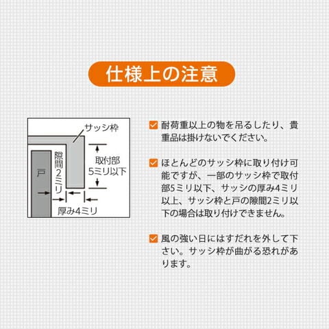 | 商品説明 | ●お得な8個セット ●耐荷重:2kg/組 ●シェード、すだれ兼用 ●工具不要 ●サッシ枠網戸に取付 ●小窓に最適 ●ネジ式で簡単取付 ●サッシ枠が傷つきにくい ●取付目安(シェード幅):1mまでの場合/2個または3個、2mまでの場合/4個または5個 ●取付方法 1.シェードフックに取り付けている締付ネジを緩めて下さい 2.最外部のサッシ窓枠または、雨戸の枠に取付金具を差し込み、締付ネジを締め付けて下さい 3.木片等を差し込んで締め付けるとよりしっかり固定されます 4.マンションのテラス、網戸へ取り付けた場合は、取付金具をいったん外し、上下逆に取り付け、締め付けネジを締め付けて下さい ●取り付けられる場所:アルミサッシ窓枠、雨戸枠、テラス、網戸など ※耐荷重以上のものを吊るしたり、貴重品は掛けないでください ※ほとんどのサッシ枠に取付可能ですが一部のサッシ枠で取付部5mm以下、サッシの厚み4mm以上、サッシ枠と戸の隙間2mm以下の場合は取り付けできません ※風の強い日にはサッシ枠が曲がる恐れがありますのですだれを外して下さい |