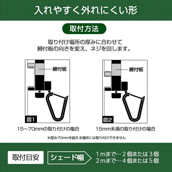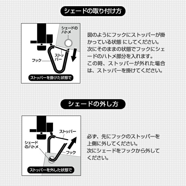 | 商品説明 | ●お得な8個セット ●取付目安(シェード幅):1mまでの場合/2個、2mまでの場合/3個または4個 ●オーニング用フック ゆれ止め ●サッシの下側に取り付けシェードがバタつかない ●ネジ式で取付簡単 ●意匠登録出願済 ●サッシ枠に傷が付かない ●ネジをゆるめて上下に調整 ●フックの位置調整がスムーズで簡単 ●可動式フックでゆれを吸収 ●ハトメを入れやすく外れにくい形 ※サッシのサイズ、形状によっては取り付けられない場合もあります ●取付方法 1.締付ネジを緩めてください 2.最外部のサッシ窓枠下部を取付金具と本体取付部の間に差し込み、締付ネジを締め付けて下さい 3.角度調整ネジをゆるめ、本体バーが動く状態にしておきます 4.フック調整ネジをゆるめた後、フックにシェードのハトメをはめ込みます 5.シェードの長さに応じて、本体バーの角度とフックの位置を調整してシェードがピンと張った状態で角度調整ネジとフック調整ネジを締め付けて下さい ●シェードの取り付け方 1.フックにストッパーがかかっている状態にしてください 2.そのままの状態でフックにシェードのハトメ部分を入れます 3.この時ストッパーが外れた場合は、ストッパーを掛けて下さい ●シェードの外し方 1.必ず、先にフック部のストッパーを上側に外して下さい 2.次にシェードをフックから外して下さい ●取り付けられる所:アルミサッシ窓枠下部 ※サッシ窓枠下部の無いサッシには取り付けできません ※サッシ窓枠下部においては、サッシ窓枠下部が16mm未満の場合には取り付けできません ※サッシ窓枠下部で取付部5mm以下、サッシ窓枠下部の厚み3.5mm以上、サッシ窓枠下部と壁の隙間1mm以下の場合は取り付けできません ※シェードの下部が本体バーの調整範囲(取り付け位置から上22cm、下15cm)に届かない場合は使用できません ※風の強い日にはサッシ窓枠下部が曲がる恐れがありますのでシェードを外して下さい ※シェードの大きさや取付部により必要に応じてゆれ止めフックの取付数を増やしてください |