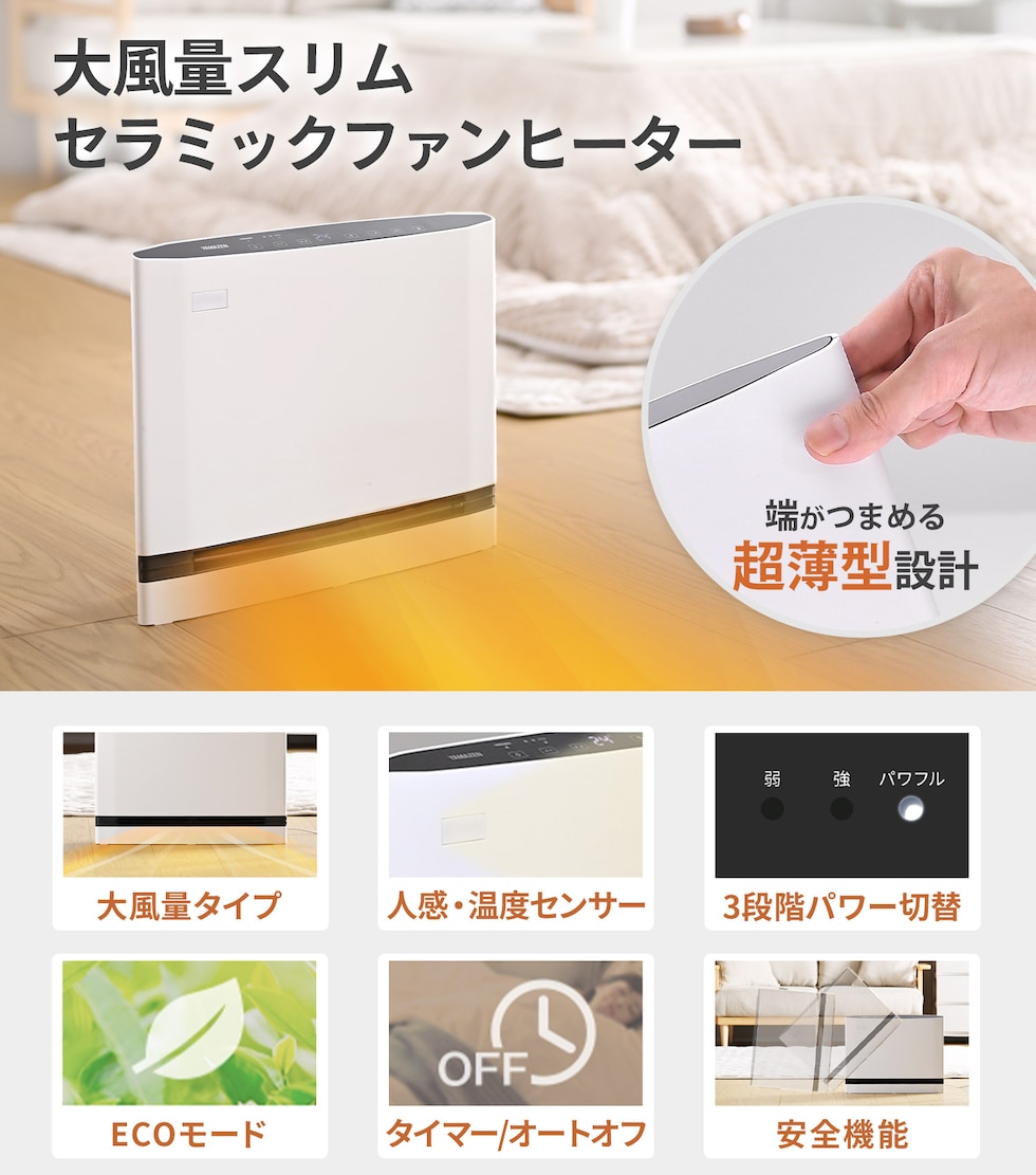 ヒーター パネルセラミックヒーター ワイド 温度センサー 人感センサー 大風量 省エネモード DSF-SP12(W) セラミックヒーター セラミックファンヒーター スリム コンパクト シンプル おしゃれ 山善 YAMAZEN 【送料無料】