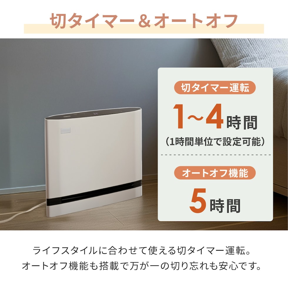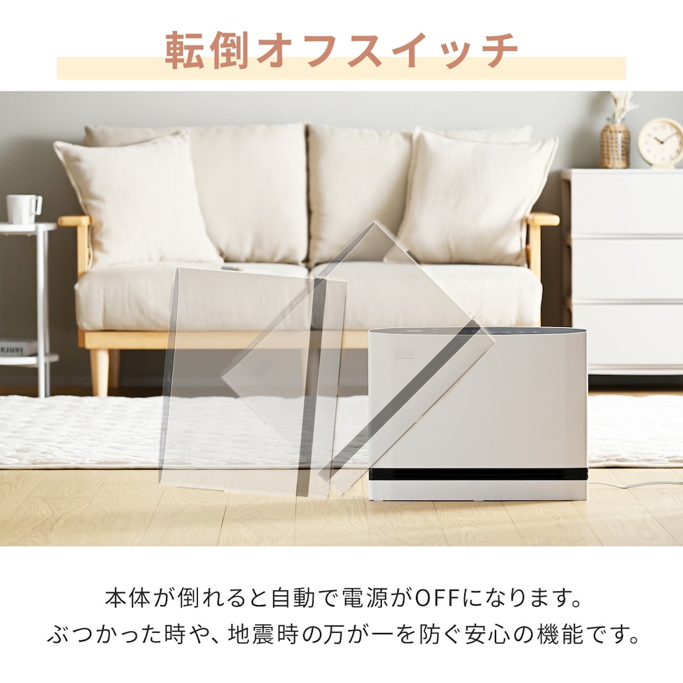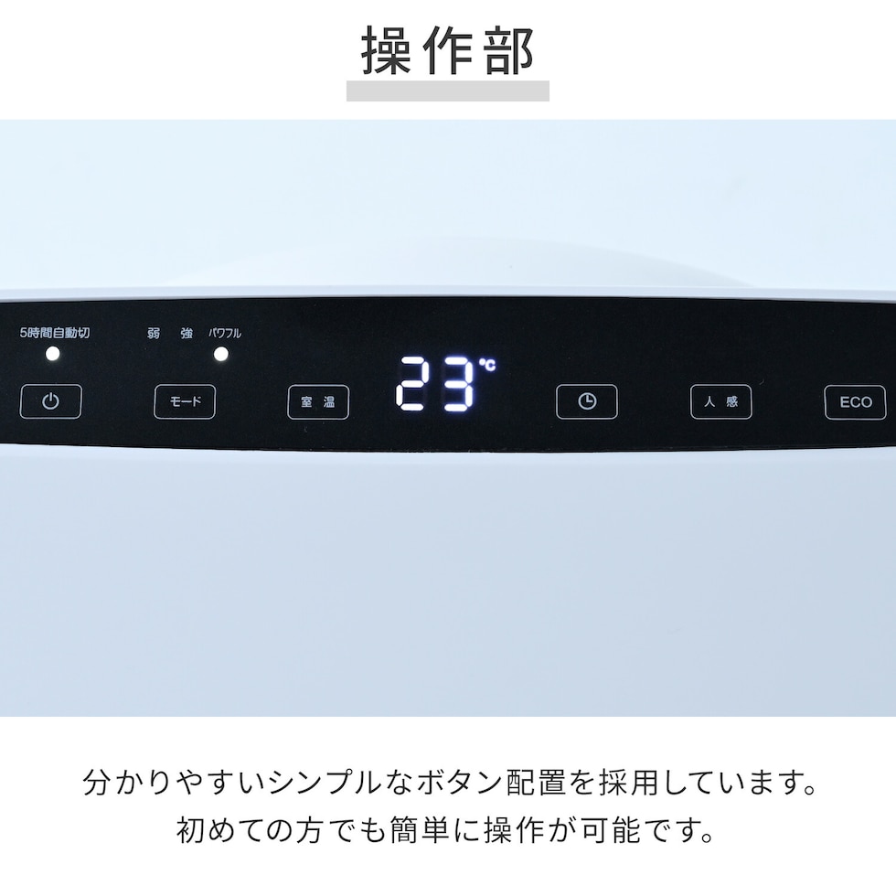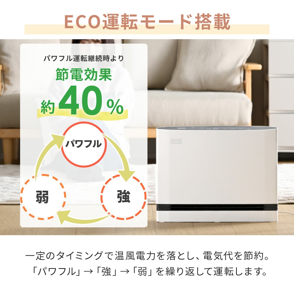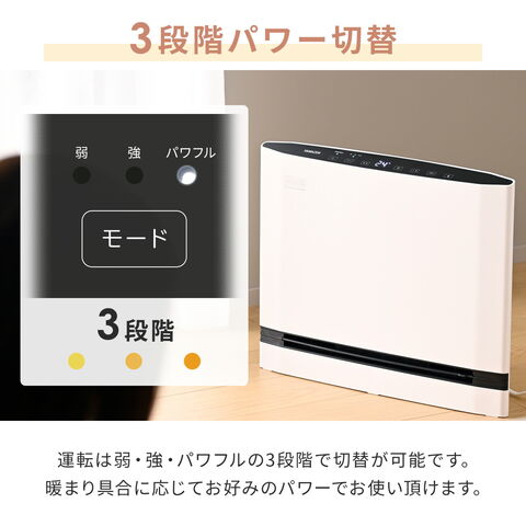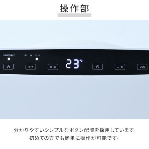 | 商品説明 | ●電源:AC100V(50/60Hz) ●消費電力:1200W ●電源コード長:約1.6m ●安全装置:転倒オフスイッチ、サーモスタット、温度ヒューズ ●温風モード3段階:弱/強/パワフル ●人感センサー搭載 ●温度センサー搭載:16/19/22/25/28度の5段階設定可能 ●ECOモード搭載:一定のタイミングで「パワフル」→「強」→「弱」を繰り返して運転します ※パワフル運転を継続するよりも約40%程度の節電になります ●切タイマー:1-4時間 ●5時間オートオフ ※人感、温度センサー運転中はオートオフ機能は働きません ●チャイルドロック搭載 ●メモリー機能:電源プラグを抜かずに運転する場合は停止前の設定で運転が始まります ●メーカー保証:1年間 ※2025年8月から型番を「DSF-VP123」から「DSF-SP12」に変更しております <仕様変更点> ・ECO運転モードをスタンダード/ワイドともに搭載しました ・人感センサーを従来の球型から平面パネル型に変更しました ・外観デザインを変更しました |