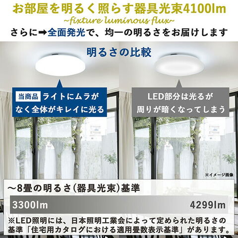 | 商品説明 | ●電源:AC100V(50Hz/60Hz) ●消費電力:37W ●全光束:4100lm ●演色性:Ra85以上 ●調光:10段階 ●30・60分OFFタイマー/ ●ワイヤレスリモコン付き ●取付できる配線器具:角型引掛シーリング、丸型引掛シーリング、丸型フル引掛シーリング、フル引掛ローゼット、引掛埋込ローゼット、ローゼット ●メーカー保証:1年 |