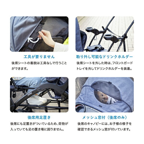 | 商品説明 | ●折りたたみ時サイズ:幅51×奥行58×高さ121cm ●使用対象:(前席)4か月から体重18kg、(後席)1か月から体重20kg ●後席が立っても座っても乗れる2WAY仕様!兄弟・姉妹で楽しく乗れる大人気ベビーカー ●眠たくなっても安心!着脱式の背もたれ付きシート ●リクライニング:(前席)2段階、(後席)無段階調整 ●ハンドル部分にはドリンクホルダーと便利な小物入れ ●各座席にフロントガードトレイ付き(※取り外し可能) ●5点式ベルト ●肩ベルト2段階調節 ●可動キャノピー(前席のみ) ●前輪サスペンション付き ●レインカバー付き |