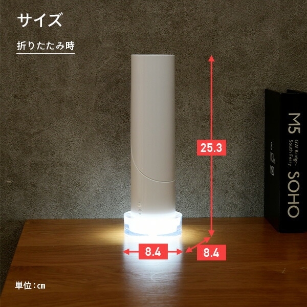 | 本体サイズ | 折りたたみ時:幅8.4×奥行き8.4×高さ25.3cm メイン照明使用時:幅17.4×奥行き8.4×高さ34.5cm 重量 約400g |