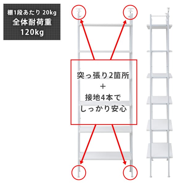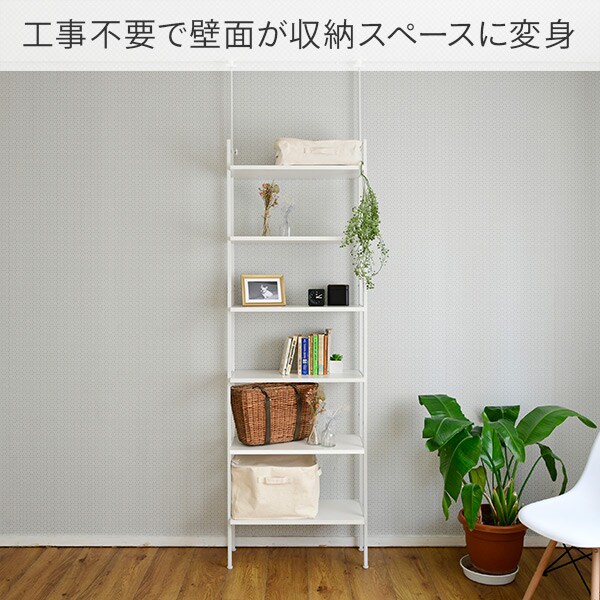 | 商品説明 | ●設置かんたん、頑丈なつっぱり固定式ラック ●つっぱり固定なので天井までのデッドスペースも有効活用 ●圧迫感のない奥行き30cmのスリム設計 ●5段の棚で仕切って、壁面を収納スペースとして活用 ●突っ張り部分は左右別々に伸縮するので、梁や凹凸のある天井でも設置可能 ●脚にはガタつきを調整できるアジャスター付き ●棚板は高さ31.5cm間隔で6段階調節可能 ●つっぱり部分もマットにした、お部屋になじむデザイン ●棚板サイズ:幅60 奥行30cm ●6段階高さ調整(31.5cm間隔) ●床から棚までの高さ(最下段):21cm ●フレーム高さ194cm ●耐荷重:棚板1段あたり20 全体100kg |