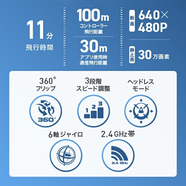 | 商品説明 | ●スマホ専用アプリ:製品専用アプリがあります ●操作周波数:2.4GHz帯 ●ジャイロセンサー:6軸ジャイロ ●飛行距離:100m ●最大飛行時間:約11分 ●解像度:30万画素(640×480P) |