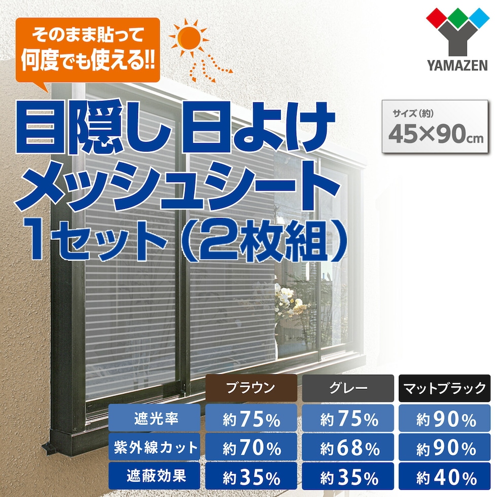 日よけメッシュシート 目隠し 45×90cm 1セット(2枚組) 遮光 遮熱 紫外線 UV 窓ガラス 簡単 貼り直し可能 AMMS-9045N 室内窓専用 日除け シール フィルム 山善 YAMAZEN 【送料無料】