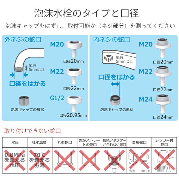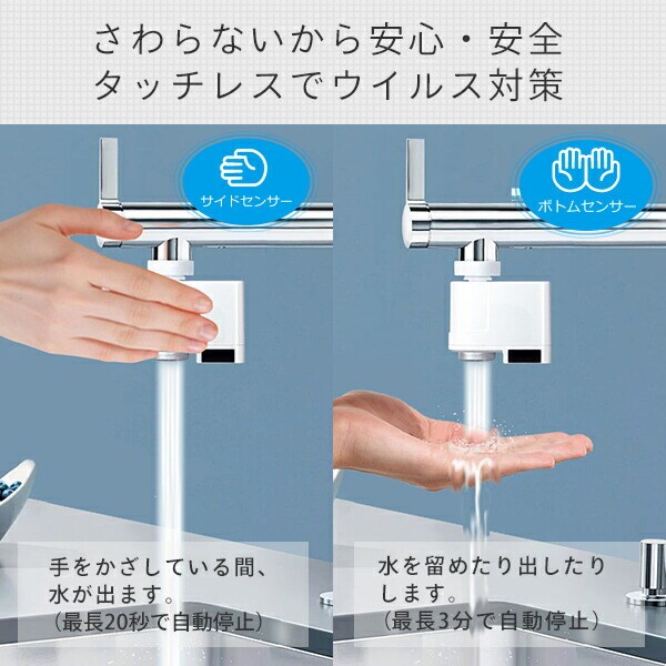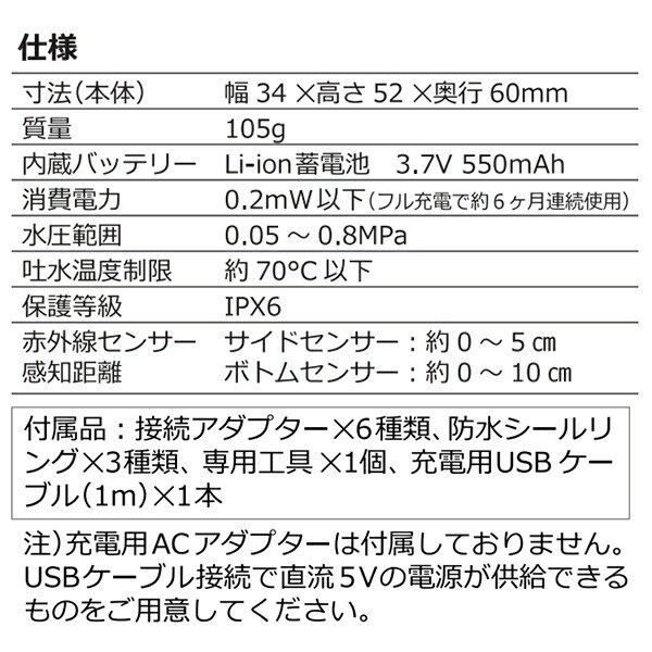 | 商品説明 | ●手を触れずに「出す」「止める」が可能 ●節水効果にも大活躍 ●内蔵バッテリー:Li-ion蓄電池 3.7V 550mAh ●消費電力:0.2mW以下(フル充電で約6ヵ月連続使用) ●水圧範囲:0.05から0.8MPa ●吐水温度制限:約70度以下 ●保護等級:IPX6 ●赤外線センサー:サイドセンサー/約0から5cm ●感知距離:ボトムセンサー/約0から10cm ●付属品:接続アダプター×6種類、防水シールリング×3種類、専用工具×1個、充電用USBケーブル(1m)×1本 ※充電用ACアダプターは付属しておりません ※USBケーブル接続で直流5Vの電源が供給できるものをご用意してください ●泡沫水栓タイプに取付が可能 ●2種類のセンサーで水栓の開け閉めを操作 ・ボトムセンサー:かざしている間だけ水が出ます(最長20秒で自動停止) ・サイドセンサー:水を出したり止めたりします(最長3分で自動停止) ※本製品は水を流しっ放しには出来ません ●泡沫水栓タイプの蛇口に取付が可能 ※屋外に設置しないでください ※温水器を破損させる恐れがあるため元止め式温水器には取り付けないでください ※故障や破損の原因になりますので瞬間湯沸かし器、太陽熱温水器などにご使用しないでください ※故障の原因になりますので温泉の水栓や飲料用電気温水器専用の水栓には取り付けないでください ※蛇口先端から奥に8.5cm以上、製品本体の底面から下まで25cm以上のスペース確保してください ※取付できない蛇口 ・水圧:0.8MPaを超える水圧 ・吐水温度:70度を超えるお湯 ・丸型蛇口 ・先がストレートの蛇口 ・接続アダプターが合わない蛇口 ・変形蛇口(角型、楕円型など) ・シャワー付き蛇口 |