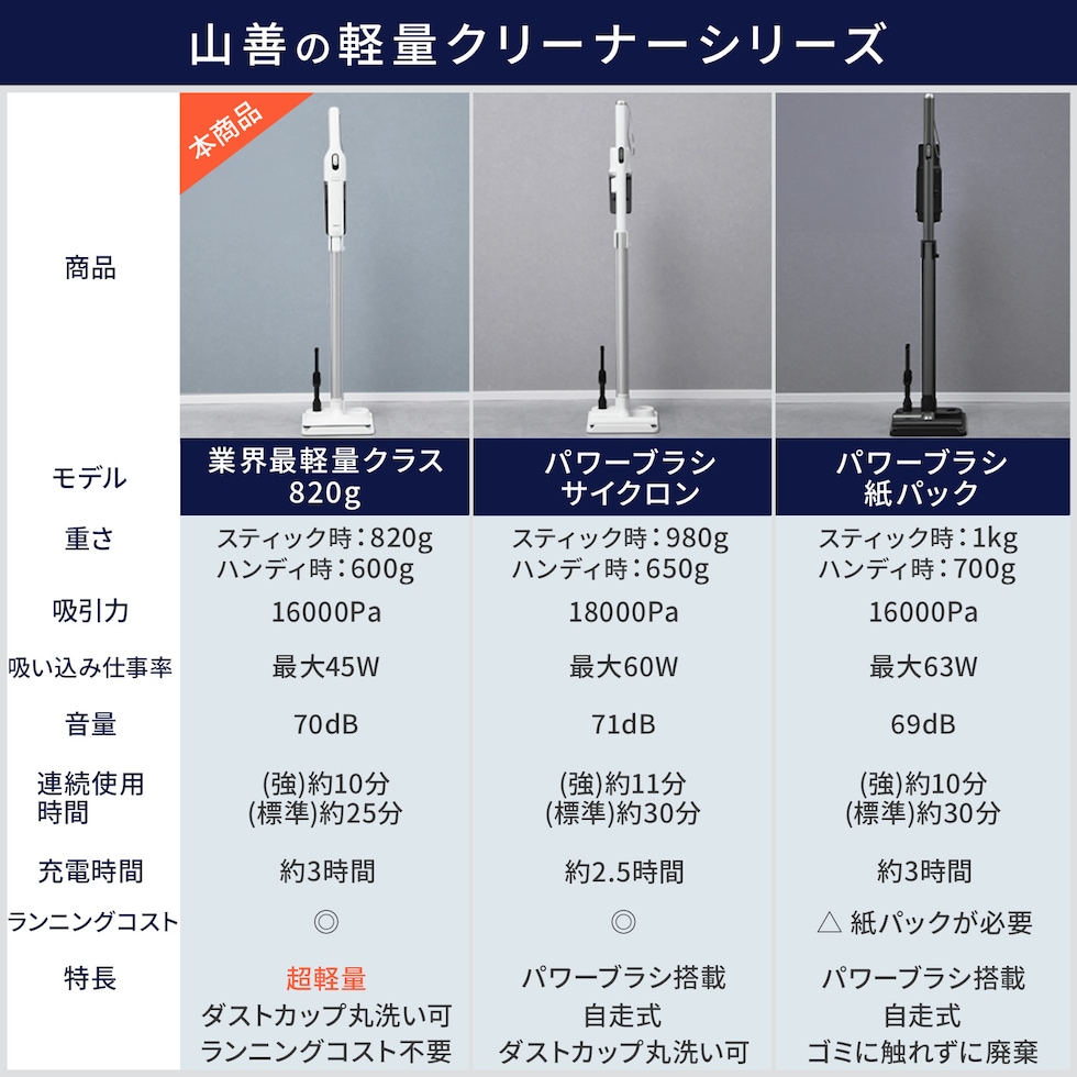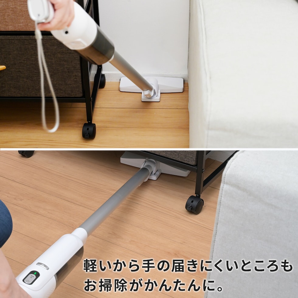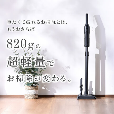 | 商品説明 | ●充電アダプター:(入力)AC100V 50/60Hz (出力)DC13.5V 650mA ●充電時間:約3時間 ●使用電池:リチウムイオン電池 11.1V 2000mAh ●連続使用時間:(強)約10分、(標準)約25分 ●吸込仕事率:45W ●集じん容量:0.2L ●運転音:69dB ●充電コード:約1.5m ●ストラップ付 ●収納に便利な専用スタンド付 ●付属品:ブラシ付きすき間ノズル、フロアノズル、延長管、充電アダプター、専用スタンド 【変更点】 ※2025年12月に商品仕様を一部変更しました。 ・新たに専用スタンドが付属 ・カラー:ホワイト→ホワイト、ブラック |