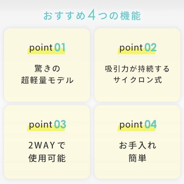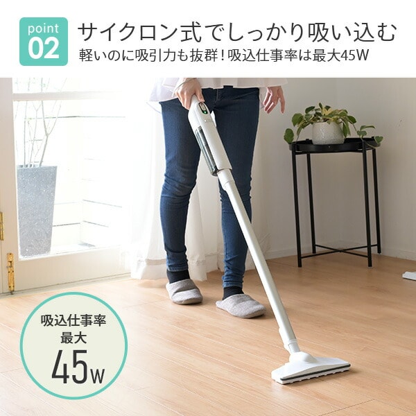 | 商品説明 | ●充電アダプター:(入力)AC100V 50/60Hz (出力)DC13.5V 650mA ●充電時間:約3時間 ●使用電池:リチウムイオン電池 11.1V 2000mAh ●連続使用時間:(強)約10分、(標準)約25分 ●吸込仕事率:45W ●集じん容量:0.2L ●運転音:69dB ●充電コード:約1.5m ●ストラップ付 ●収納に便利な専用スタンド付 ●付属品:ブラシ付きすき間ノズル、フロアノズル、延長管、充電アダプター、専用スタンド 【変更点】 ※2025年12月に商品仕様を一部変更しました。 ・新たに専用スタンドが付属 ・カラー:ホワイト→ホワイト、ブラック |