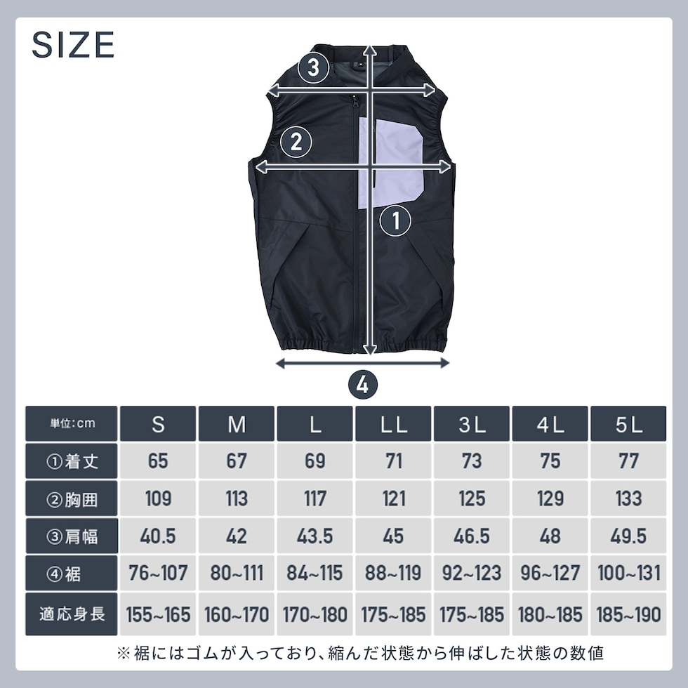 | 本体サイズ | 【ウェア】 ■サイズ・Sサイズ:着丈65×胸囲109×肩幅40.5cm、裾76-107cm(適応身長155-165cm) ・Mサイズ:着丈67×胸囲113×肩幅42cm、裾80-111cm(適応身長160-170cm) ・Lサイズ:着丈69×胸囲117×肩幅43.5cm、裾84-115cm(適応身長170-180cm) ・LLサイズ:着丈71×胸囲121×肩幅45cm、裾88-119cm(適応身長175-185cm) ・3Lサイズ:着丈73×胸囲125×肩幅46.5cm、裾92-123cm(適応身長175-185cm) ・4Lサイズ:着丈75×胸囲129×肩幅48cm、裾96-127cm(適応身長180-185cm) ・5Lサイズ:着丈77×胸囲133×肩幅49.5cm、裾100-131cm(適応身長185-190cm) ※裾にはゴムが入っており、縮んだ状態から伸ばした状態の数値 ■素材:ポリタスラン 【バッテリー】 幅6.7×奥行1.5×高さ10.9cm、重量115g ●原産国:ジャケット:ミャンマー、ファン・バッテリー:中国 |