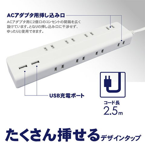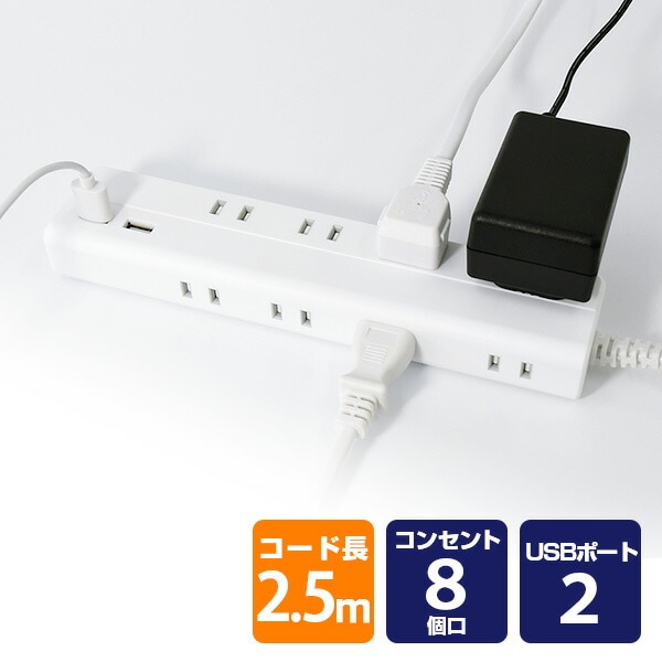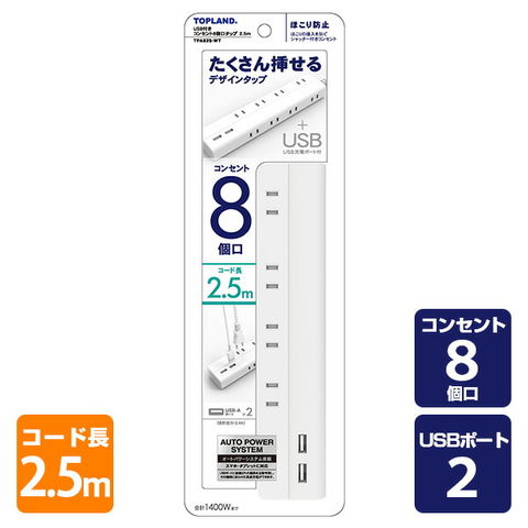 電源タップ 延長コード 電源コード 8個口 コンセントタップ USBポート 2個口 2.5m 合計1400Wまで TPA825-WT ホワイト 電源 たこ足 タコ足 タコ足配線 8口タップ USB2ポート USB延長コード 延長ケーブル OAタップ トップランド TOPLAND 【送料無料】