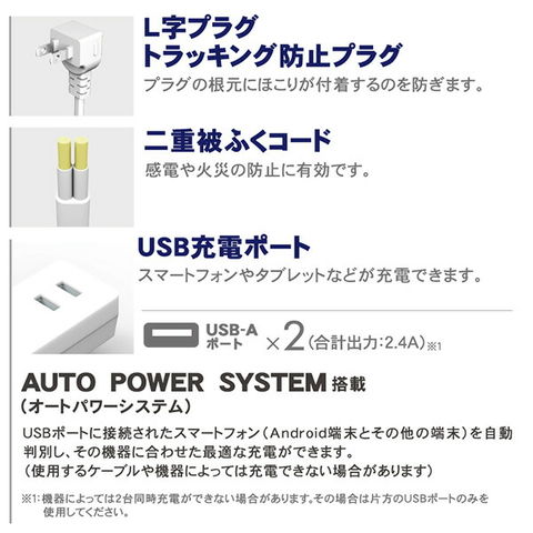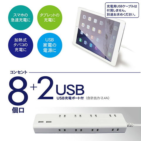 | 商品説明 | ●合計1400Wまで ●コンセント差し込み口:8個 ●USBポート口:2個 ●USB最大出力:2.4A ●L字プラグ採用 ●ホコリの侵入を防ぐ設計のコンセント部シャッター付きの差込口採用 ●オートパワーシステム搭載:USBに接続された機器を自動判別し、その機器に合わせた充電が可能 ●コード長さ:約2.5m |
