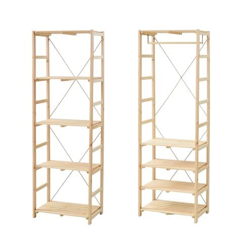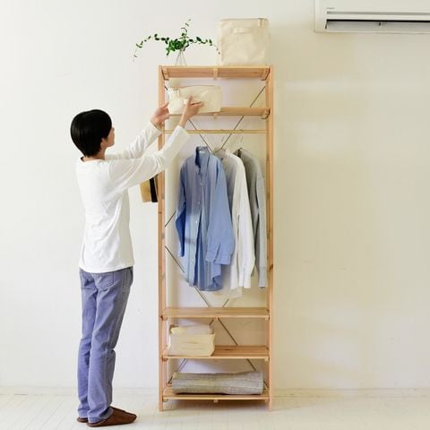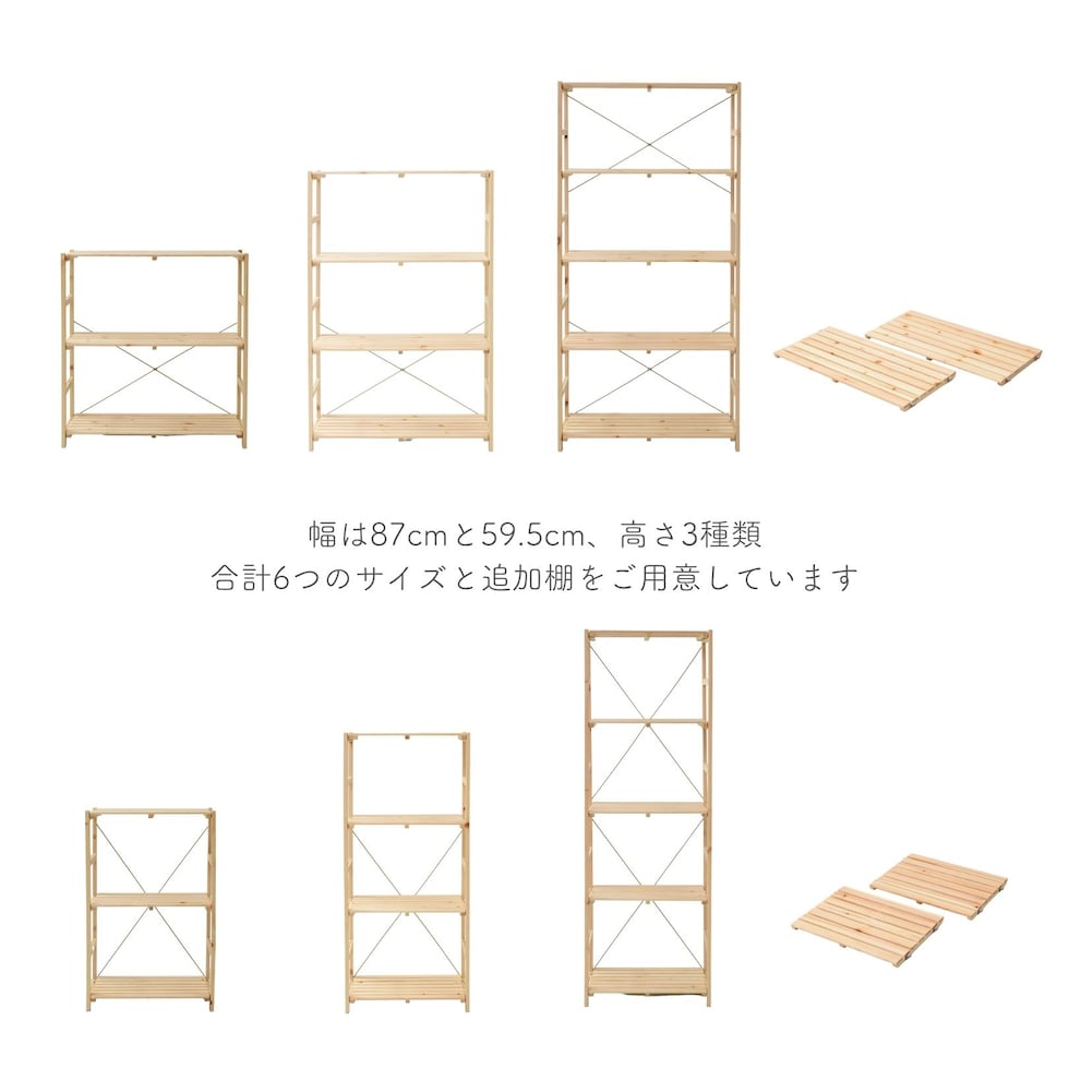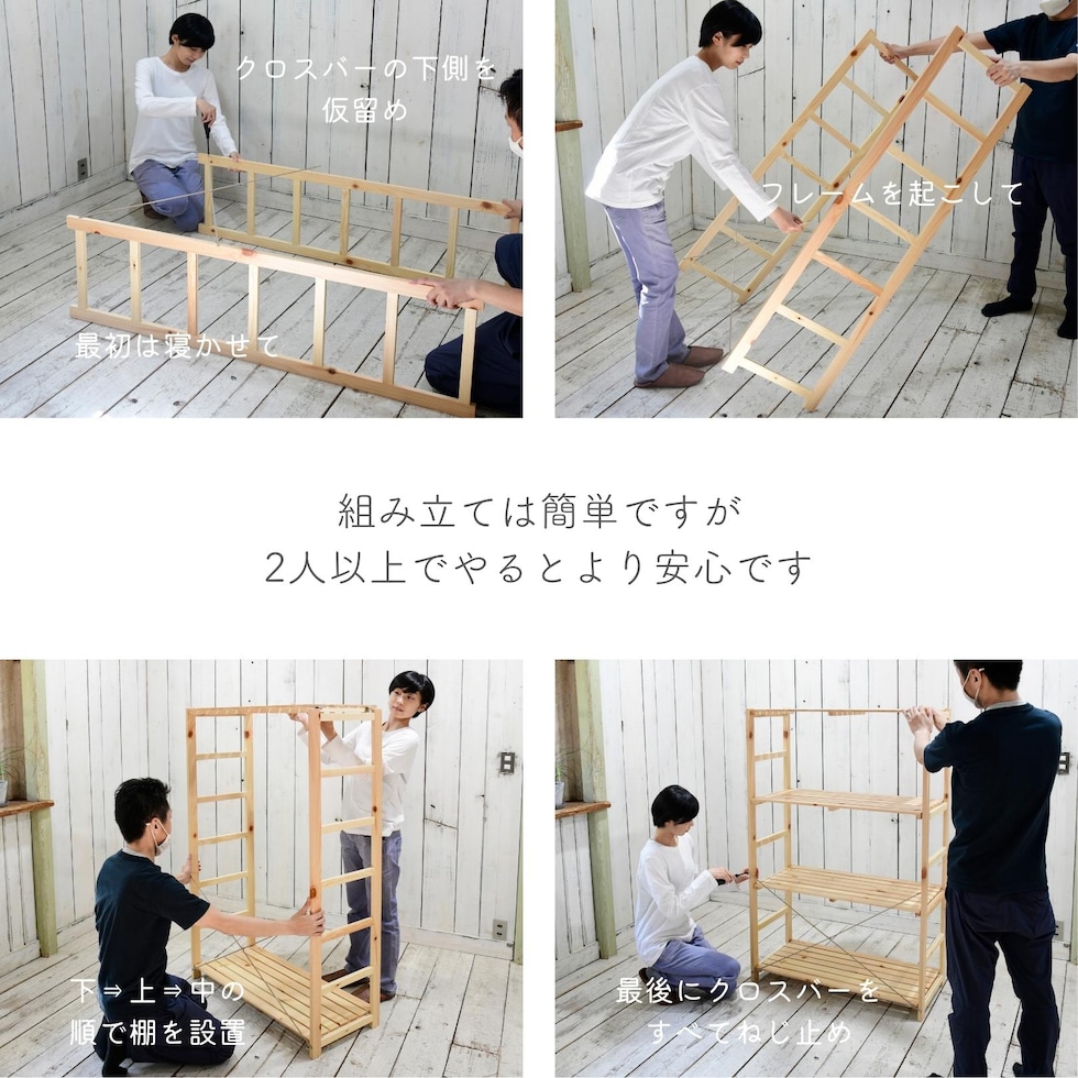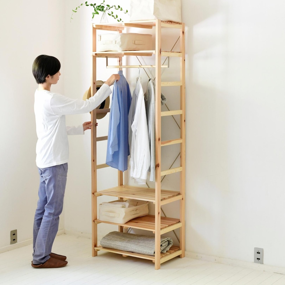 | 商品説明 | ●※本品は設計上、左右の横揺れを感じやすいつくりになっています。 ●パイン材のすのこ棚になった、ぬくもりのあるシェルフ ●市販の収納ボックスの収まりやすいサイズ設計で、おうちすっきりを応援 ●ハンガーバー1本も付属、服も鞄もひとまとめに収納可能 ●棚板は載せるだけの構造で、高さ調整も簡単 ●棚の高さは21.5cm間隔で変更可能 ●ハンガーバーは棚板に連結、設置高さは選択・変更可能 ●可動式棚板サイズ:幅55 奥行38.5cm ●ハンガーバー:幅55 直径約2cm ●背面にはクロスバー付属(上側には位置決めのガイド穴あり) ●別売りの棚板があり、複数台を連結も可能 ●耐荷重:棚板1枚当たり10kg、ハンガーバー5kg、全体55kg |