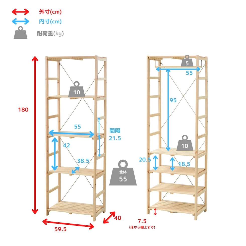 | 本体サイズ | 幅59.5×奥行40×高さ180cm 重量12kg |