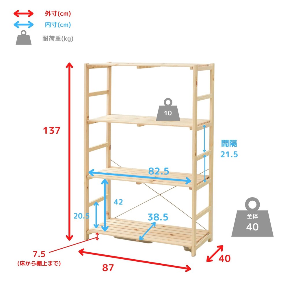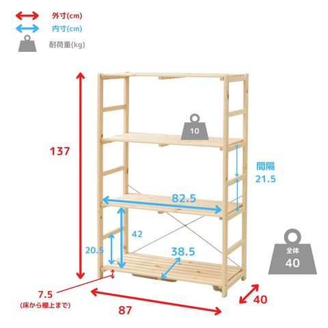 ●耐荷重:棚板1枚当たり10kg、全体40kg