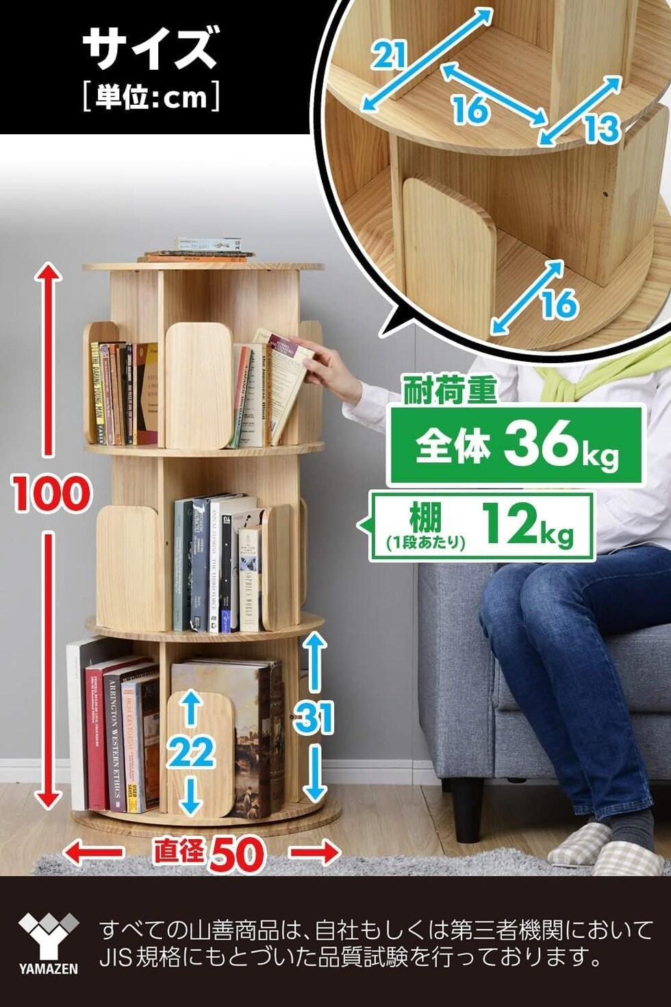 本棚 回転式 木製 3段 直径50 高さ100cm 360度回転 絵本棚 天板に物が置ける A4が入る高さ 天然木 漫画 小さい本棚 ブックシェルフ 組立品 山善 YAMAZEN 【送料無料】のレビュー
