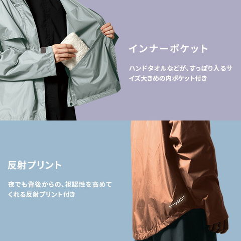 | 商品説明 | ●軽量・コンパクトなレインウエア。畳んでかわいい巾着ポーチに収納!天候の変わりやすい時期に便利なアイテム ●耐水圧:ジャケット 8000mmH2O、パンツ 10000mmH2O。耐水圧10000mmH2Oだと、大雨の日にも対応できます(※洗濯を繰り返したり使用時の摩擦によって機能は少しずつ低下します) ●ジャケットは、ポリエステル生地に透湿性のあるポリウレタン樹脂コーティングを施した防水機能素材。ムレを軽減します ●ジャケットの透湿度は、5000g/m2-24h!1平方mあたり24時間で、なんと5000gの水分を透過させる機能です ●ウエア生地の表面は、水をはじく撥水加工!雨に濡れても水をサッと払えます ●フードは、雨の日でも視界を遮らない透明ツバ付き。内側に折り込んで収納可能 ●胸元にベンチレーションを付け、着用時のムレを軽減 ●タオルなどが入る大きめのインナーポケット付き ●夜でも背後から視認性を高めてくれる反射プリント付き ●レインブーツを履いたまま着脱可能なワイドパンツ。自転車運転時は、裾調節ボタンで裾をタイトにでき、自転車巻き込みの心配を軽減 【注意事項】 ●ドライクリーニングとアイロンはお避け下さい ●汚れは石けん水か中性洗剤を使用し、やさしく手洗いしてください ●精密機械などをポケットに入れた場合、湿気等で破損の恐れがあります。ご注意下さい ●製品に縫いつけられている洗濯表示に従って洗濯してください ●製品に縫いつけられている洗濯表示に従って洗濯してください ●直射日光を避け日陰で吊り干ししてください。乾燥機の使用は厳禁です ●火の側で乾燥させたり、着用したまま火の側に近づくことは絶対にお避けください |