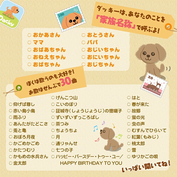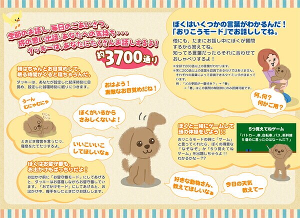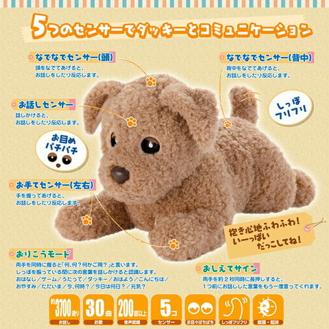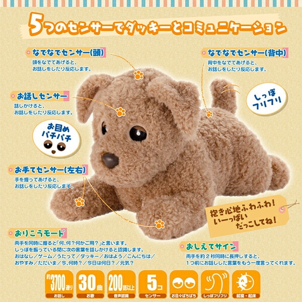 | 商品説明 | ●季節や時間帯によって変化する3,700通り以上の様々なお話しと童謡全30曲のお歌を収録 ●200語以上の音声を認識し、ダッキーとの対話を楽しめ、嬉しいとダッキーは尻尾をふりふり ●ダッキーが脳トレゲーム(なぞなぞ・5つ覚えてねゲーム)を出題 ●本体内蔵の5つのセンサーが反応して、お話やお歌を歌いながら、まばたきをしてくれます(おやすみの時には目を閉じます) ●ユーザーが好きな「起床時間」「就寝時間」を設定!規則正しい生活をサポート ●ユーザー呼称を10種類(パパ、ママ、おじいちゃん、おばあちゃん、など)の中から選択でき、誕生日のお祝いもしてくれます ●ダッキーと遊んでリラックスできるおうち時間を |