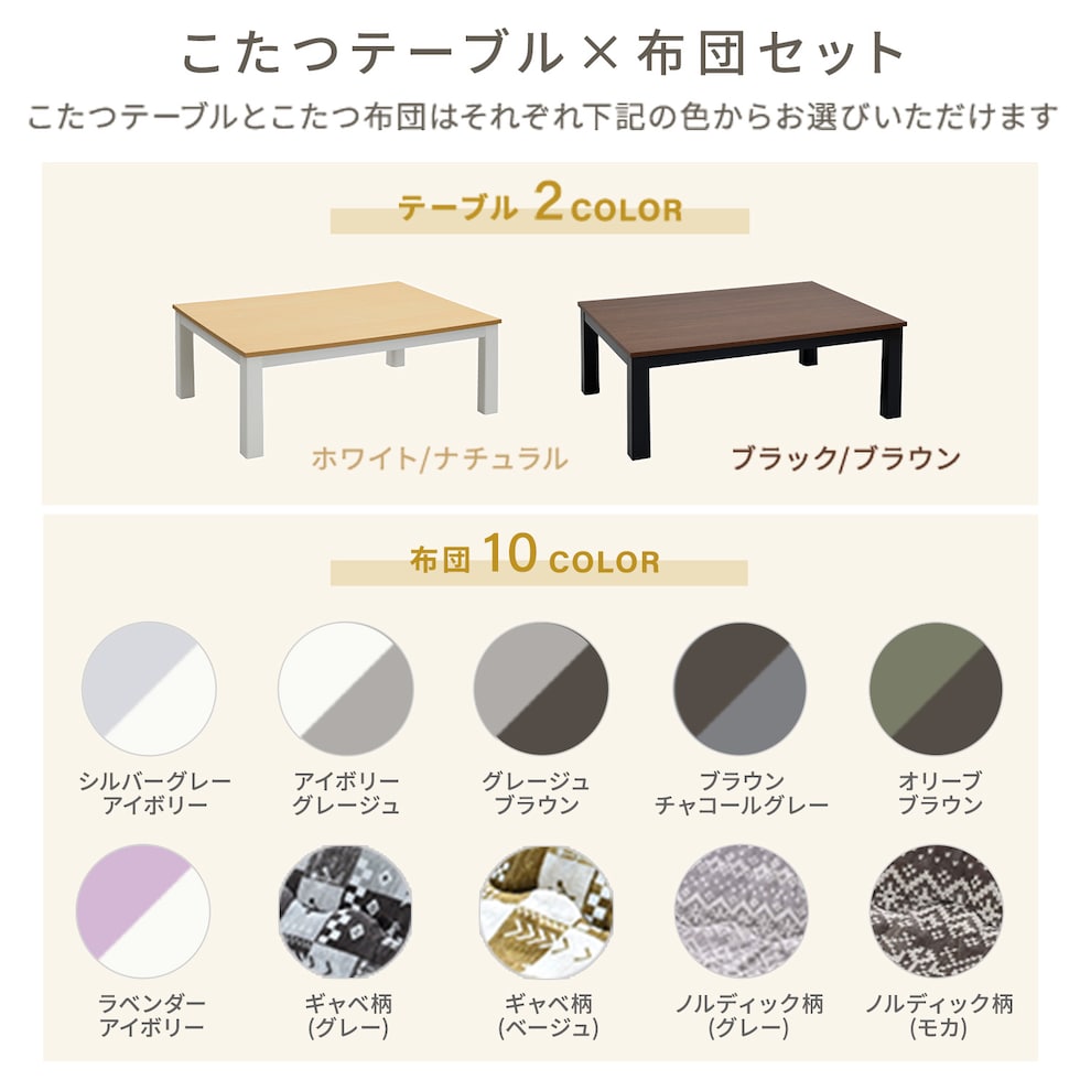| 商品説明 | ●こたつテーブル本体のみかこたつテーブル本体とこたつ布団の2点セットからお選びいただけます 【こたつ本体】 ●電源:100V (50Hz/60Hz) ●ヒーター型番:MS-303H ●消費電力:300W ●電気代目安(1時間あたり):(強)5.0円、(弱)2.5円 ※電力料金目安単価1kWhあたり31円(税込)で算出 ●電源コード:中間入切スイッチ ●電源コード長さ:3m ●メーカー保証:1年 【こたつ布団】 ●さらふわな肌触りのフランネル生地を両面に使用 ●ほこりの出にくい、ポリエステル綿をたっぷり1.8kg ●取っ手付き収納袋付きでオフシーズンもコンパクトに収納 ●無地柄はリバーシブルで使用可能 ●※圧縮状態でお届けします。開封後、およそ1日ほどで復元します。 ●2024年8月より布団セットの販売ページに変更しています。 |