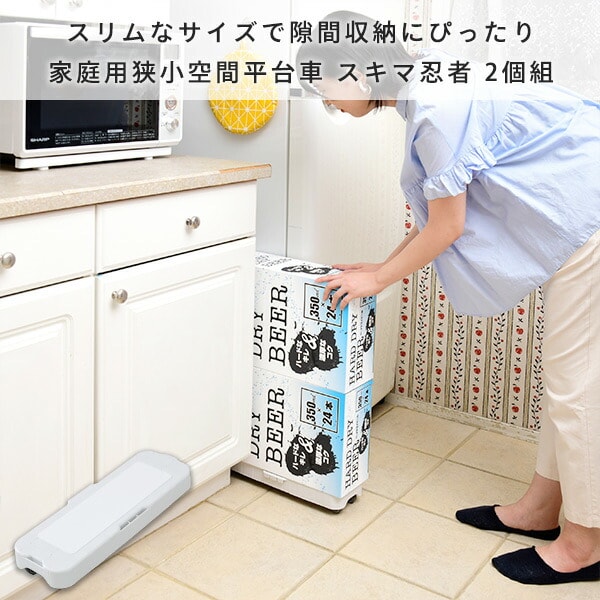 | 商品説明 | ●隙間を収納スペースに活用できる家庭用平台車「スキマ忍車」 ●お得な2台セット ●同シリーズのスマートフロア(NST-50)の半分の幅でスリム設計なのでおうちのちょっとした隙間にぴったり ●幅14cm以上の隙間に使用可能 ●キャスターが見えにくい設計なのでインテリアとしての馴染むデザイン ●縦にも横にも連結可能 ●同シリーズのスマートフロア(NST-50)とも連結可能 ●床を傷つけにくく静かに運べるエラストマー製の工業用キャスターを採用 ●なめらかに滑り、静かに出し入れができ、床への色移りもありません ●収納したいモノを台車に載せ、冷蔵庫とシンクの間や食器棚の隙間など、空いた隙間に入れるだけで収納力UP ●大きな荷物を移動したいときには本製品2台を運搬物の両端の底面に配置することで、台車代わりとして利用できます ●天板には滑り止めシートが付いており、移動中の運搬物のズレを防ぎます ●使わないときもコンパクトなので、保管に場所を取りません ●耐荷重:30kg/台あたり |