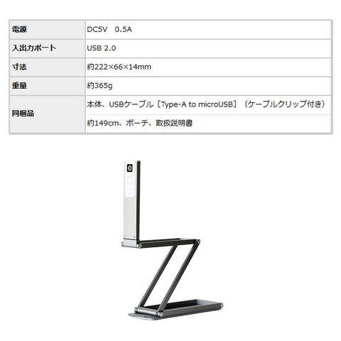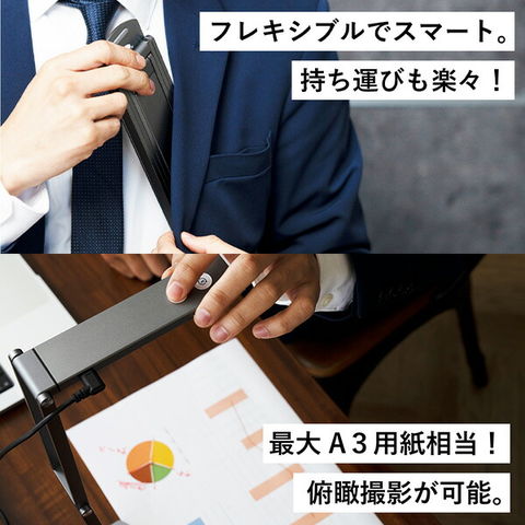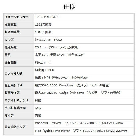 | 商品説明 | ●一般的なPC内蔵カメラより高画質の4K(総画素1322万画素)、ハイクオリティーのオンラインコミュニケーションが実現 ●三脚やアームなどのアクセサリー無しで、角度も高さも自由自在 ●収納時の薄さわずか1.4cm。手軽に持ち運べるので外出先での使用にも便利 ●簡単に俯瞰撮影ができる。最大A3用紙相当のエリアを投影可能(※Windowsの場合) ●3段階調節可能なLEDライト搭載 ●カメラ上部にマイク内蔵 ●カメラ部分は180度回転可能 ●オートフォーカス採用し、映像の天地もボタンで簡単に反転操作できる ●パソコンからmicroUSBで給電できる 【仕様】 ●イメージセンサー:1/3.06型 CMOS ●総画素数:1322万画素 ●有効画素数:1313万画素 ●レンズ:f=3.37mm F/2.2 ●焦点距離:23.2mm(35mmフィルム換算) ●画角:水平69度/垂直54.4度/対角81.3度 ●撮影距離:約10cm~∞ ●ファイル形式:静止画/JPEG、動画/MP4(Windows) MOV(Mac) ●画角サイズ:静止画/最大3840×2880px(Windows"カメラ"ソフトの場合)、動画/最大3840×2160px 30fps(Windows"カメラ"ソフトの場合) ●最大撮影エリア:Windows"カメラ"ソフト/3840×2880pxにて約412×307mm、Mac"Quick Time Player"ソフト/1280×720pxにて約420×228mm ●電源:DC5V/0.5A ●入出力ポート:USB2.0(Type-A to microUSB) ●付属:USBケーブル(ケーブルクリップ付き)、ポーチ、取扱説明書 |