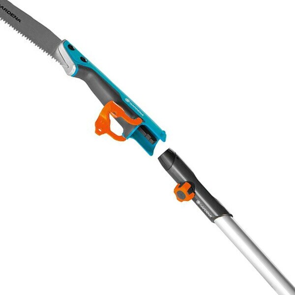 シンプルな手ノコとして使用するほか、GARDENAコンビシステムの棒(別売り)に取り付けると、高さ5メートル近くの枝まで届き作業可能