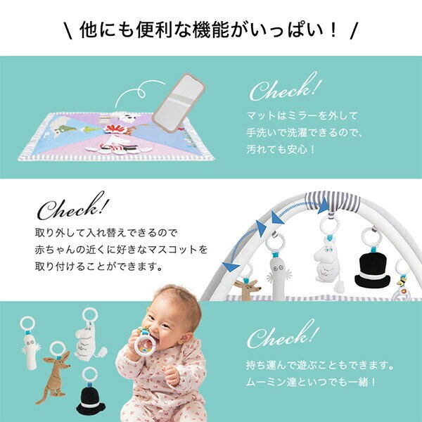 | 商品説明 | ●ムーミン谷の仲間たち人形5体と、アーチ2本、マットのセット ●ねんね期、はらばい期、おすわり期など赤ちゃんの成長過程に合わせて長くお使いいただけます ●マットはミラーを外して洗濯可能なので汚れても安心! ●全てのおもちゃにC型リングがついているので取り外して持ち運べます ●ムーミンは振るとフエの音が、スニフは振るとカラカラ音が、ニョロニョロはにぎるとカサカサ音がします ●パパの帽子は鈴の音が。赤ちゃんの興味をそそるミラー付き ●ちょうちょうのラトル ●ママの部分にある貝殻をめくると数字のお勉強ができます ●花の茎の部分はリボン仕様で楽しい仕掛けに 【マット、あおむしのピローお手入れ方法】 ※低温の水を使用し、手洗いしてください ※漂白剤は使用しないでください ※アイロンがけ、乾燥機およびドライクリーニングは不可 ※移染の恐れがありますので、他の物と一緒に洗わないでください |