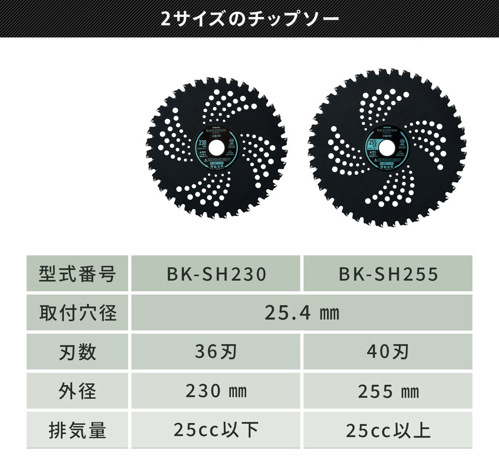 | 商品説明 | ●刈り払機用チップソー ●用途:雑木・雑草・荒地 ●職人が認めた鋭い切れ味と耐久性 ●強力斜め埋込でチップ飛び軽減 ●安心のJIS規格 【BK-SH230】 ・取付穴径:25.4mm ・刃数:36 ・外径:230mm ・おすすめ排気量:25cc以下 【BK-SH255】 ・取付穴径:25.4mm ・刃数:40・外径:255mm ・おすすめ排気量:25cc以上 |