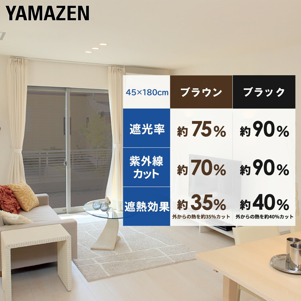 | 商品説明 | ●カラーは「ブラウン」「ブラック」の2色展開 ●45×180cmサイズが2枚で1セットになります ●貼りやすく、目線のみ隠したいときにも最適 ●目線、日射し、光熱費を同時にカット ●貼り直しも簡単で何度でも使える(※長時間使用後の貼り直しは出来ません) ●凹凸ガラスにも貼れます ●断熱効果で冷房効率UP 【ブラウン】 ●遮光率:約75% ●紫外線カット:約70% ●遮熱効果:約35% 【ブラック】 ●遮光率:約90% ●紫外線カット:約90% ●遮熱効果:約40% |