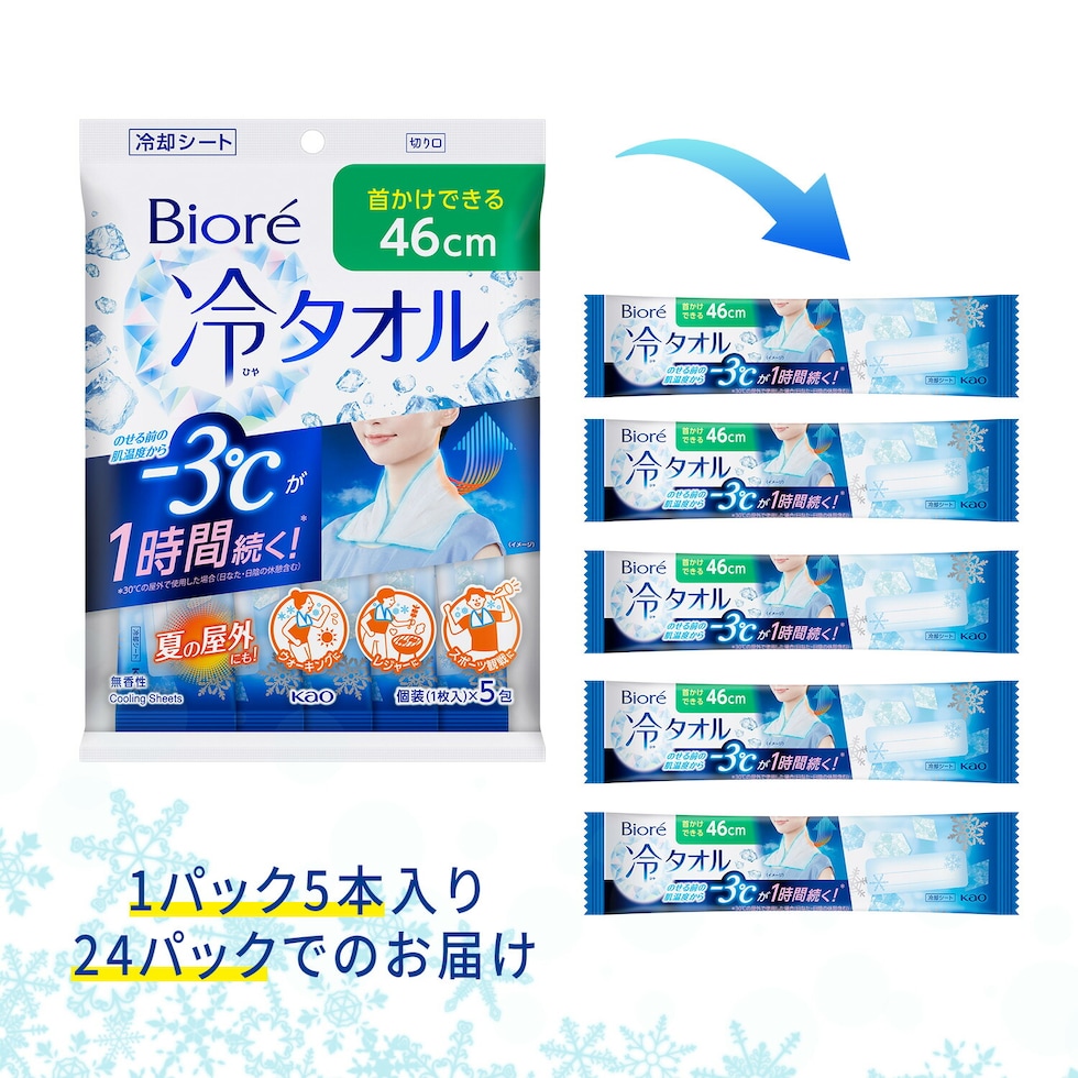 ビオレ 冷タオル 無香性 5本入×24パック(120本) 個包装 日本製 冷却タオル 冷却シート 冷却 ひんやり 熱中症対策 暑さ対策 首かけ 厚手 持ち運び 携帯 ウォーキング レジャー スポーツ観戦 運動会 屋外作業 フェス ケース販売 花王 Kao 【送料無料】