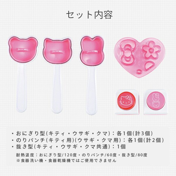 | 本体サイズ | おにぎり型/キティ:約幅5×奥行3.5×高さ12.5cm おにぎり型/ウサギ:約幅4.5×奥行3.5×高さ13.5cm おにぎり型/クマ:約幅4.5×奥行3.5×高さ13cm のりパンチ(キティ/ウサギ/クマ):約幅5×奥行4.5×高さ3.5cm 抜き型:約幅6.5×奥行5×高さ1cm |