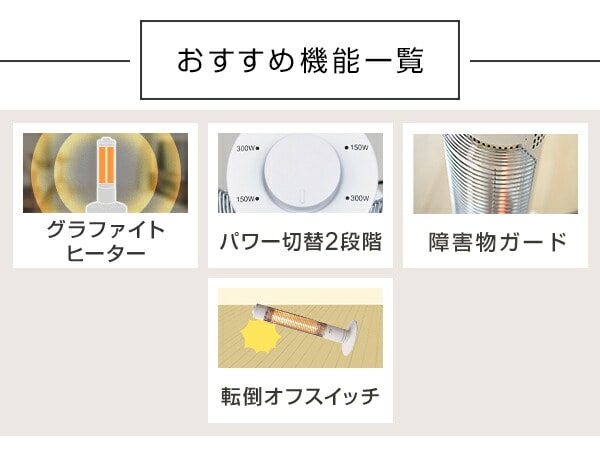 | 商品説明 | ●電源:AC100V(50/60Hz) ●消費電力:150W(弱)、300W(強) ●電気代目安(1時間あたり):約8円/h(強) ●発熱体:グラファイトヒーター ●障害物ガード採用 ●コード長さ:1.5m ●安全装置:転倒オフスイッチ ●メーカー保証1年付き |