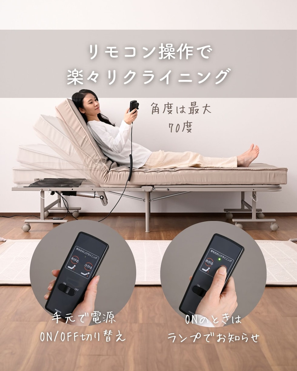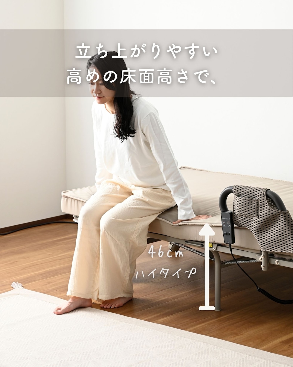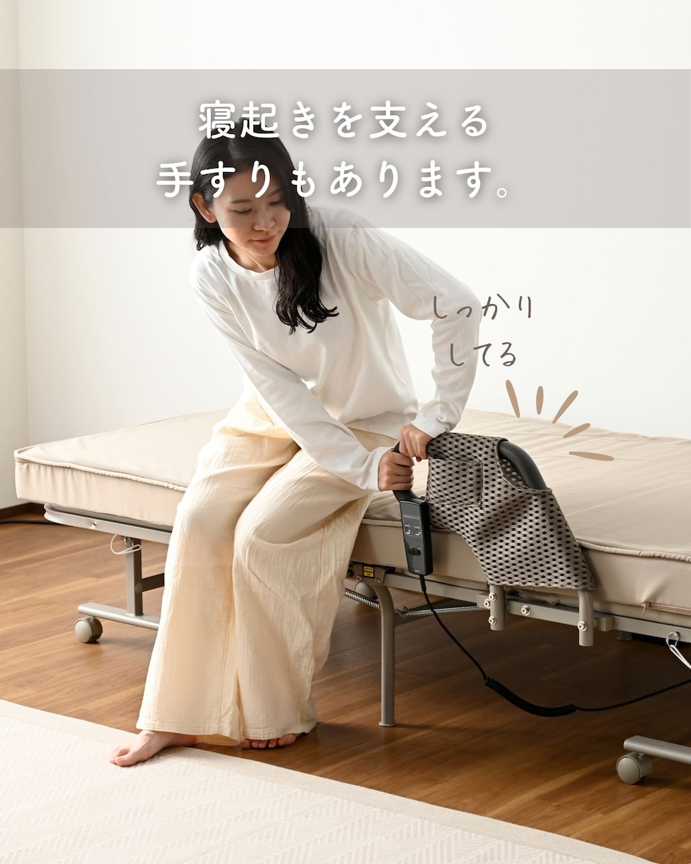 | 商品説明 | ●キャスター取り付け済み、本体完成品でのお届け。手すりのみお客様取り付け(六角レンチ付属) ※重いため、お二人以上での搬入をお願いします。 ※2026年2月12日より、仕様変更して再販いたします。 【変更点】(1) マットレスが高反発・1枚ものに (2)リクライニングが背もたれのみに (3)取っ手が寝起きしやすい手すりタイプに (4)カバーを取り外して洗濯可能に ●マットレス一体型の、電動リクライニングベッド ●高反発ウレタンフォームを使った、寝返りのしやすいマットレス(着脱は不可) ●マットレスの上部はファスナーで付け外しができ、洗濯機で洗濯可能(要ネット使用) ●一枚ものなので、従来の折りたたみベッドに比べて越し当りを改善 ●いざとなったらたたんで移動もできる、折りたたみ&キャスター付き ※マットレスがしっかりしているので、折りたたみ作業時はマットの結び目を解除して動かしてください。 ●寝起きもしやすい床面ハイタイプ ●寝起きをサポートする手すり付き、左右どちらにでも設置可能 ●背もたれの電動リクライニングは、手元のリモコンでラクラク操作 ●モーター部、リモコンには1年保証付き ●手すりにはリモコンや携帯をしまえる小さなポケット付き ●ベッド下はモーターやスプリングがあるため収納には使用不可 ●荷重の目安: 静止90kg ●床面サイズ: 幅97 長さ195cm ●床面高さ: 46cm ●ベッド下高さ: 30cm ●背もたれ高さ: 60cm ●背もたれリクライニング: 約70度 ●リモコンコード長さ:120cm ●定格周波数50/60Hz、消費電力33W ●最小折りたたみ時:幅56 奥行104 高さ114cm |