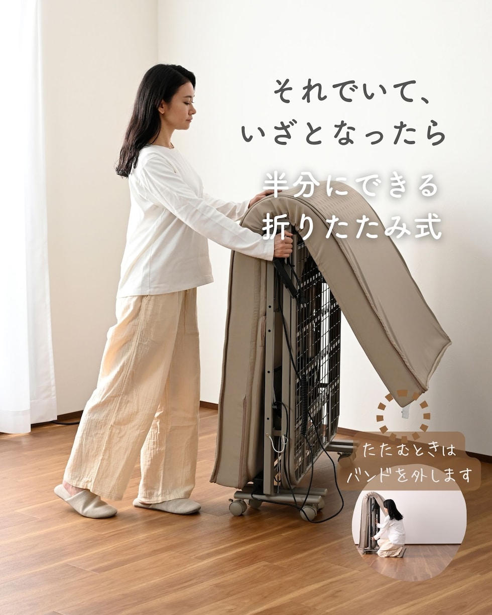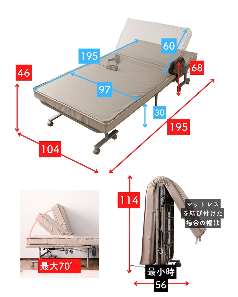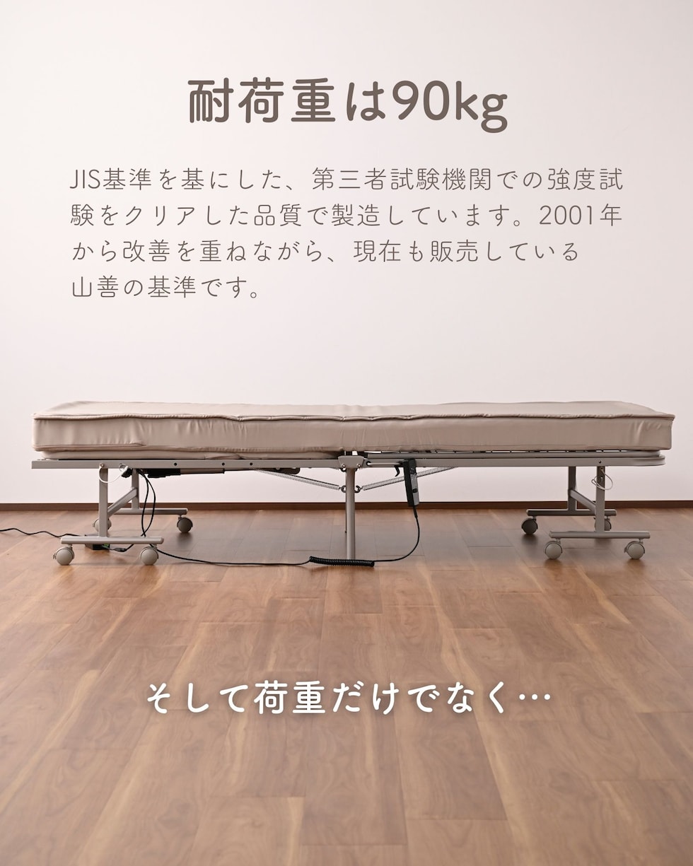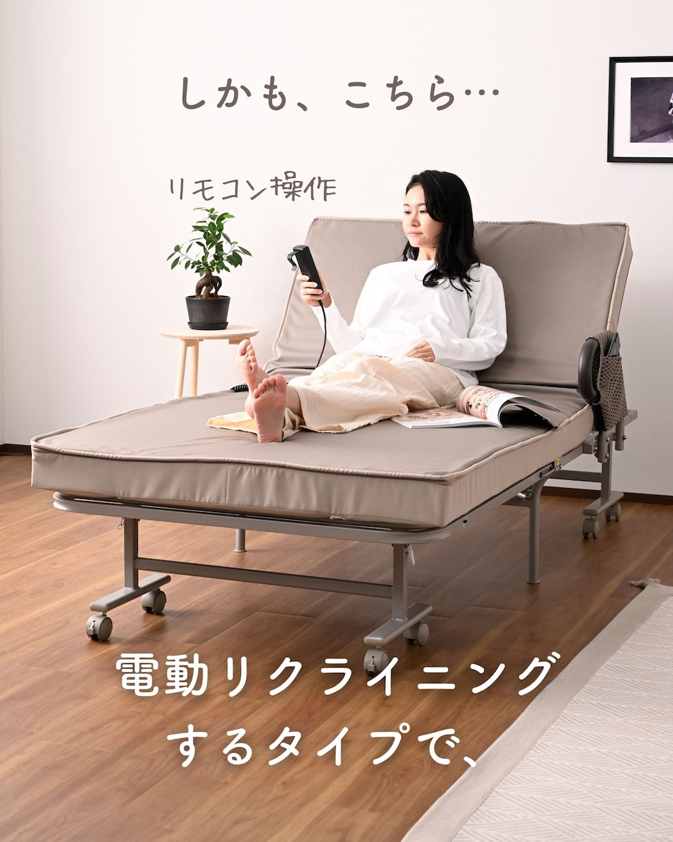 | 商品説明 | ●キャスター取り付け済み、本体完成品でのお届け。手すりのみお客様取り付け(六角レンチ付属) ※重いため、お二人以上での搬入をお願いします。 ※2026年2月12日より、仕様変更して再販いたします。 【変更点】(1) マットレスが高反発・1枚ものに (2)リクライニングが背もたれのみに (3)取っ手が寝起きしやすい手すりタイプに (4)カバーを取り外して洗濯可能に ●マットレス一体型の、電動リクライニングベッド ●高反発ウレタンフォームを使った、寝返りのしやすいマットレス(着脱は不可) ●マットレスの上部はファスナーで付け外しができ、洗濯機で洗濯可能(要ネット使用) ●一枚ものなので、従来の折りたたみベッドに比べて越し当りを改善 ●いざとなったらたたんで移動もできる、折りたたみ&キャスター付き ※マットレスがしっかりしているので、折りたたみ作業時はマットの結び目を解除して動かしてください。 ●寝起きもしやすい床面ハイタイプ ●寝起きをサポートする手すり付き、左右どちらにでも設置可能 ●背もたれの電動リクライニングは、手元のリモコンでラクラク操作 ●モーター部、リモコンには1年保証付き ●手すりにはリモコンや携帯をしまえる小さなポケット付き ●ベッド下はモーターやスプリングがあるため収納には使用不可 ●荷重の目安: 静止90kg ●床面サイズ: 幅97 長さ195cm ●床面高さ: 46cm ●ベッド下高さ: 30cm ●背もたれ高さ: 60cm ●背もたれリクライニング: 約70度 ●リモコンコード長さ:120cm ●定格周波数50/60Hz、消費電力33W ●最小折りたたみ時:幅56 奥行104 高さ114cm |