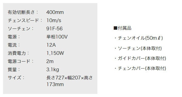 | 商品説明 | ●有効切断長さ:400mm ●チェンスピード:10m/s ●ソーチェン:91F-56 ●電源コード:2m ●付属品 チェンオイル(50ml)、ソーチェン(本体取付)、ガイドカバー(本体取付)、チェンカバー(本体取付) ●作業用途が広がる、フルカッタソーチェン採用 ●工具なしでチェン刃の張り調節ができる ●自動給油 ●ブレーキ付き |