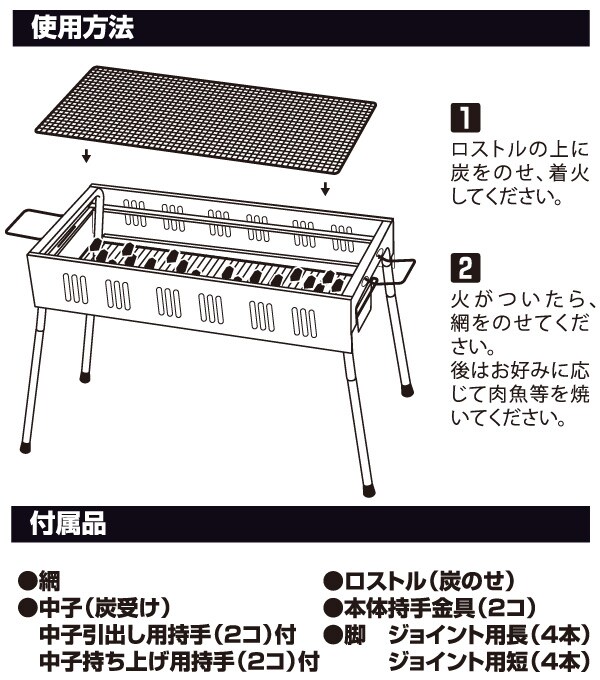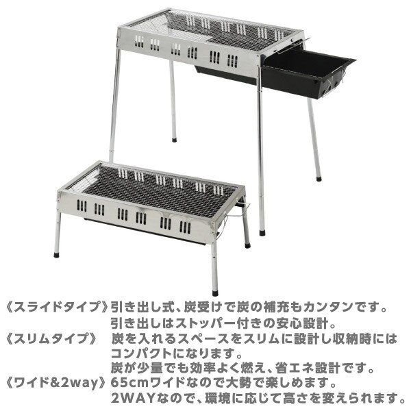 | 商品説明 | ●網サイズ:幅61.5×奥行29cm ●炭の出し入れが容易なスライドタイプ ●引き出しはストッパー付きの安全設計 ●炭を入れるスペースをスリムに設計し、収納時はコンパクト ●炭が少量でも効率よく燃える省エネ設計 ●65cmのワイドサイズなので大勢で楽しめる ●耐久性に優れたステンレス素材 ●環境に応じて高さを変えられる2WAY仕様 ※2018年4月11日より外観をリニューアルしました |