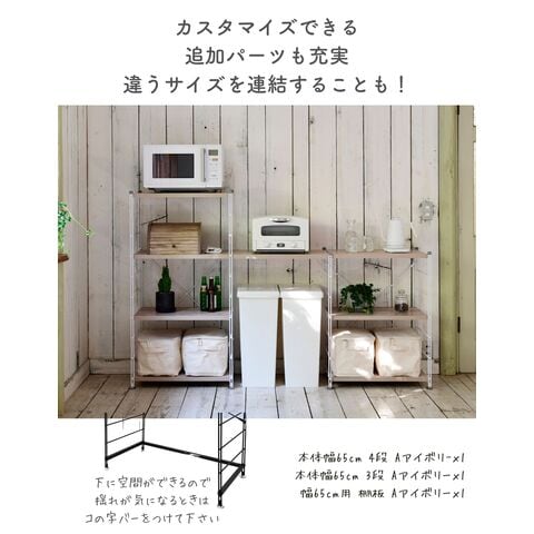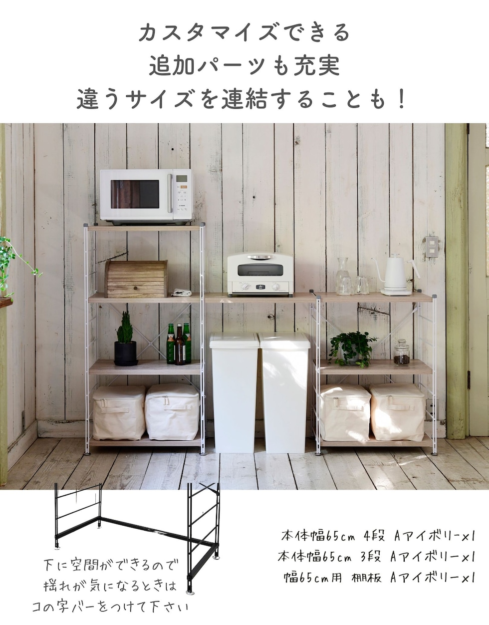 | 商品説明 | ●プラスドライバーをご用意ください。 ※重量もあるため、お二人以上での組み立てをおすすめいたします。 ※簡単設置構造のため、横揺れします。耐荷重には影響ございませんが、ご利用時に気になる場合は、『コの字補強バー』もご利用ください。 ※本体外寸の「幅」は、足元のアジャスターの外側?外側の寸法になります。 ※2024年1月15日より、クロスバー2点仕様に順次改定して参ります。従来品とはクロスバーの長さが異なります。 ※2022年2月2日より、新色Aホワイトが追加されました。 ●モノに合わせて棚の位置を変えられる木製棚板のスチールラック ●インボックスなど収納ボックスが縦にすっぽり収まるサイズ設計 ●棚板は木の質感があってお手入れもかんたんな、合成樹脂化粧繊維板 ●軽くて強いフラッシュ構造で、1段あたり25kgの耐荷重 ●フックでフレームに引っ掛けるだけなので、位置の変更もかんたん ●棚板を追加したり複数揃えると、フラットに横連結可能 ●脚部には、ガタつきを抑えるアジャスター付き ●耐荷重: 1段あたり25kg、全体100kg ●可動式棚板4枚(板の厚さ2.5cm、約12.5cm間隔、10段階高さ調節) ●(最下段時)棚板下5.4cm ●棚板サイズ: 幅80 奥行き37.5cm ▼別売りパーツの取り扱いを2022年1月より開始しました ・キャスターセット(ストッパー付き2個、ストッパーなし2個) ・追加棚板 ・コの字補強バー ・帆立(側フレーム、片側ずつ) ・クロスバー ●専用キャスター装着時耐荷重: 1段あたり25kg 全体100kg ●専用キャスター装着時: 本体高さ128cm ▼2025年1月より以下のパーツが追加となります。 ・2段引き出し ・スライド棚 ・ストッカー+コの字バー |