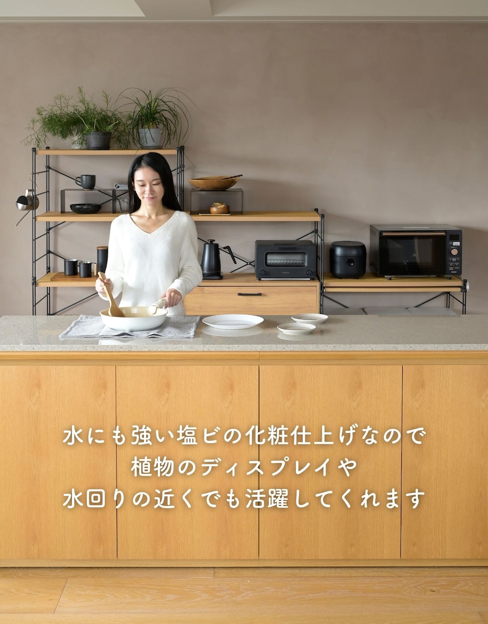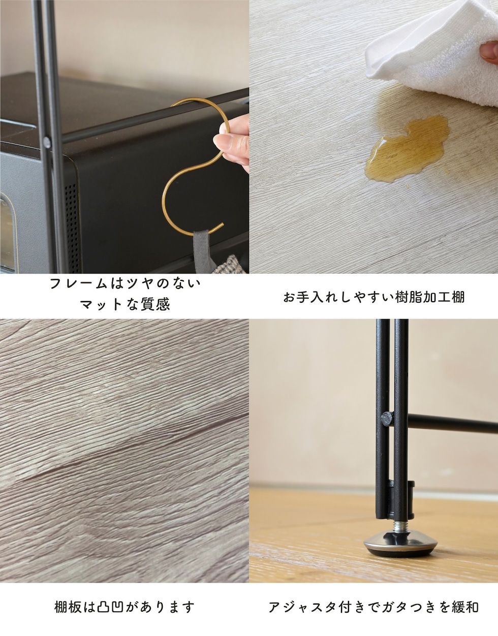 | 材質 | フレーム:スチール(粉体塗装) 棚板:合成樹脂化粧繊維板(塩化ビニル樹脂) |