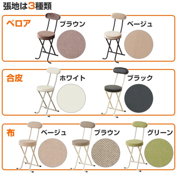 | 商品説明 | ●クッション付の座面と背もたれ ●使わない時はたたんで収納 ●座面高:48cm ●座部サイズ:幅30 奥行30cm ●背部サイズ:29×10cm ●クッション厚み:背部4cm、座部5cm |