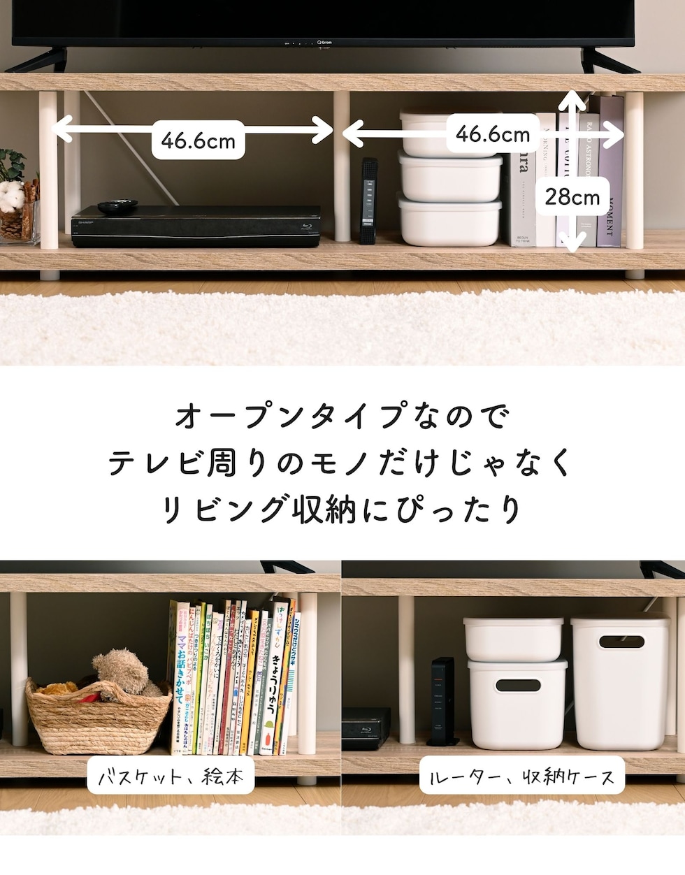 ●レコーダーや市販の収納ボックス、絵本もすっきり収まる