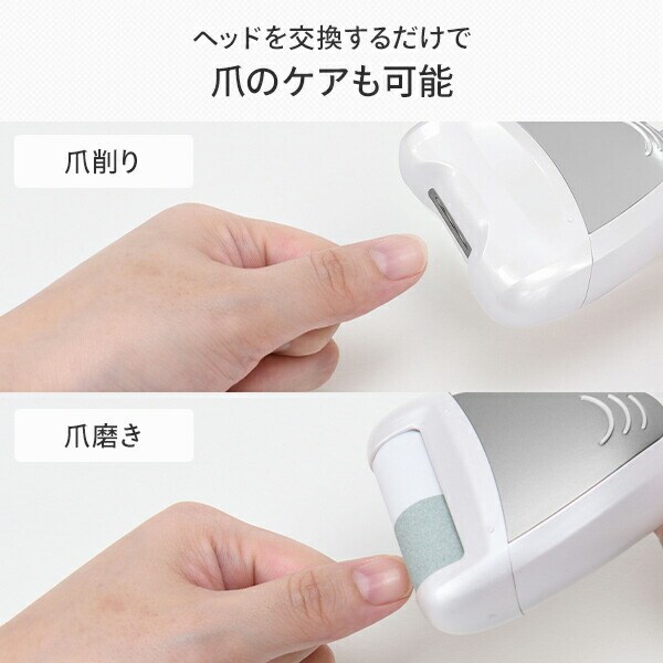| 商品説明 | ●角質削りヘッド:最も硬い角質取りといわれるダイヤモンドパウダー配合 ●硬くなった角質をスピーディーに削り、なめらかなかかとへ仕上げることが可能 ●ヘッドを付け替えるだけで、爪のお手入れも可能 ●伸びた爪にあてるだけ。力もいらない快適な電動爪切り ●爪磨きローラー:2種類のヤスリが付いているので爪の形を整えることも磨くことも可能 ●USB充電式で持ち運びに便利 ●充電時間/使用時間:4-8時間/30-40分 ●付属品:ヘッド3種(角質削りヘッド、爪削りヘッド、爪磨きヘッド)、掃除用ブラシ、USBコード●保証期間:1年 |