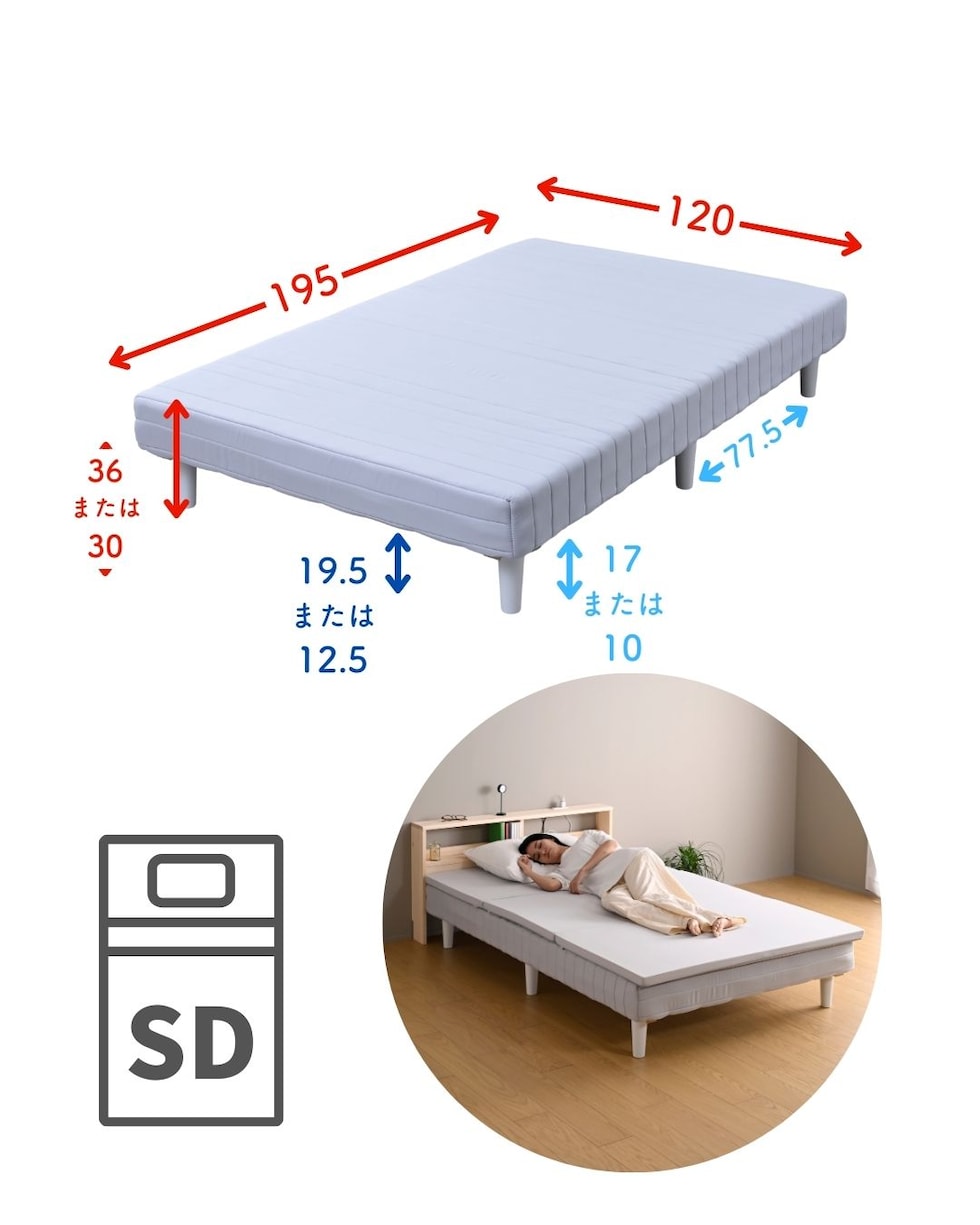 | 商品説明 | ●圧縮梱包で玄関先までお届け、開封後約1~3日で復元します。(環境により時間が前後します。) 2025年9月30日より、脚ホワイト・ロータイプをバリエーション追加しました。 ●組み立て簡単にできる、スプリングマットレス一体型のベッド ●脚高17cmの従来に加え、圧迫感のない10cm高さのロータイプが仲間入り ●静止耐荷重:200kg(保証値ではございません。) 本製品は7000N(700kg相当)の荷重試験をクリアした商品です。 当社では安全を考慮し、本商品は耐荷重200kgに設定しております。 ●独自構造で耐荷重も安心 ●本体内蔵の木枠と、後付の補強枠・脚を取り付けて完成 ●マットレスの張地は滑らかなポリエステル素材を使用 ●ベッド下有効高さ:側面17cm、脚側19.5cm ポケットコイルタイプ ●コイル数 【S】450個、【SD】570個、【D】660個、【SSS】364個 ●線径:2.3cm ●マット厚:17cm ●プラ脚直径:6.5cm ●脚から脚まで【S/SD/D】幅77.5cm、【SSSのみ】幅69cm |