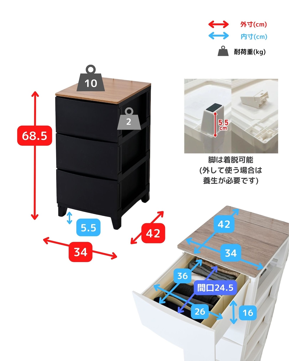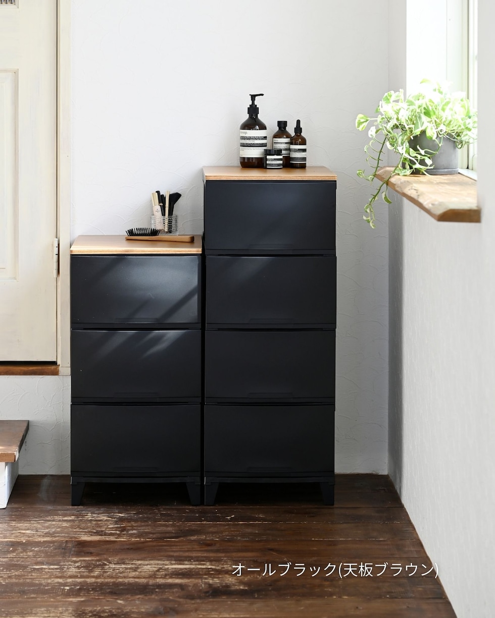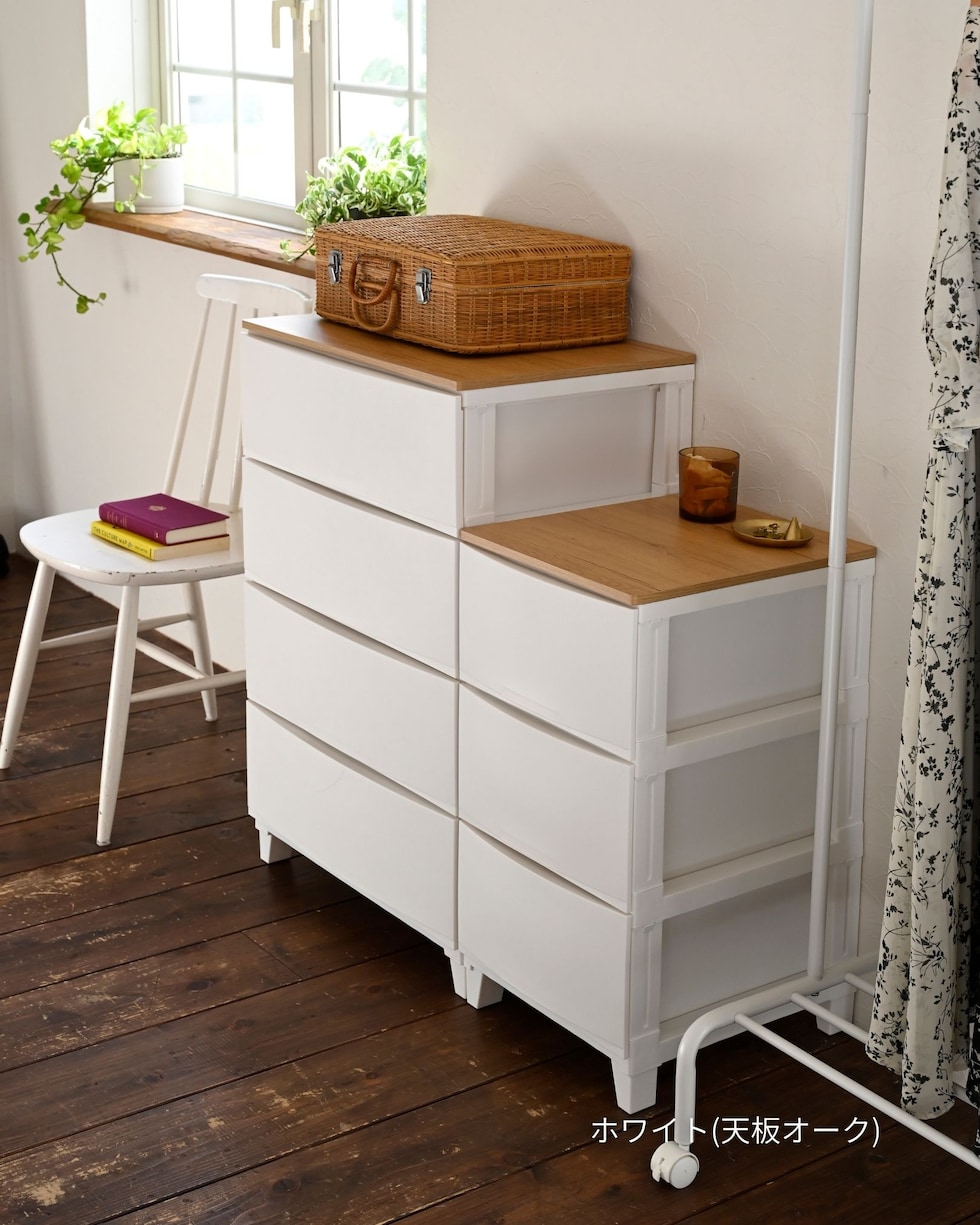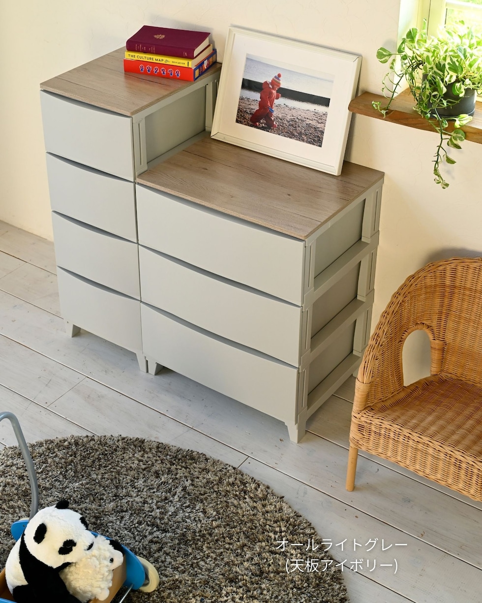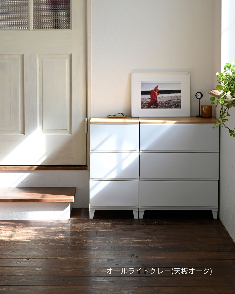 | 商品説明 | ●※2026年2月5日より、木天板付きタイプとしてリニューアルします。カラーもホワイト、グレージュ、ライトグレー、ブラックのシンプル系に変更しての販売となります。 ●中身を隠せる、すっきりデザインの収納チェスト「ルームス」シリーズ ●天板強度を改善できて色も選べる、木製天板付き ●「すーっと引いて、スキっと閉まる」、引き出しは軽くて出し入れラクラク ●マットな質感の「シェード」カラー ●工具不要で組み立てかんたん ●脚部裏面用の滑り止め合成ゴムシート付属 ●脚の高さ: 約5.5cm ●引出し内寸: 幅26 奥行36.2 深さ16.5cm ●1段あたりの収納目安: セーター3枚、Yシャツ5枚、バスタオル3枚 ●耐荷重: 天板 約10kg(均等に荷重をかけた場合)、引出し1段あたり 約2kg ※下段から重いものを入れてご使用ください。 ●天板耐熱温度: 約80℃ ※複数台並べた際、天板同士は隙間や段差が生じる場合がございます。水平にならない点、予めご了承ください。 ※木製天板のみ中国製 |