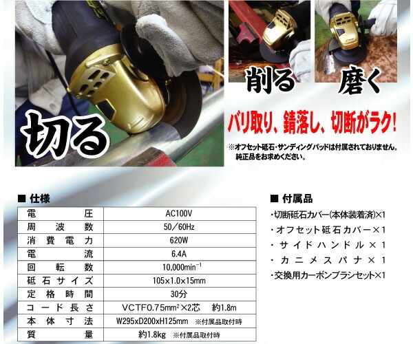 | 商品説明 | ●電圧:AC100V ●周波数:50/60Hz ●消費電力:620W ●電流:6.4A ●回転数:毎分10,000 ●砥石サイズ:105×1.0×15mm ●定格時間:30分 ●コード長さ:VCTF0.75平方mm×2芯 約1.8m ●付属品:切断砥石(金の卵)×3、切断砥石カバー(本体装着済)×1、オフセット砥石カバー×1、サイドハンドル×1、カニメスパナ×1、交換用カーボンブラシセット×1 ●メーカー保証1年付き |