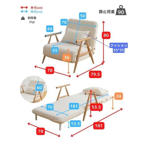 | 本体サイズ | 【ソファ時】幅78×奥行80×高さ79.5 (座面高さ36)cm 重量19kg 【ベッド時】幅78×奥行181×高さ53.5 (床面高さ24)cm |
